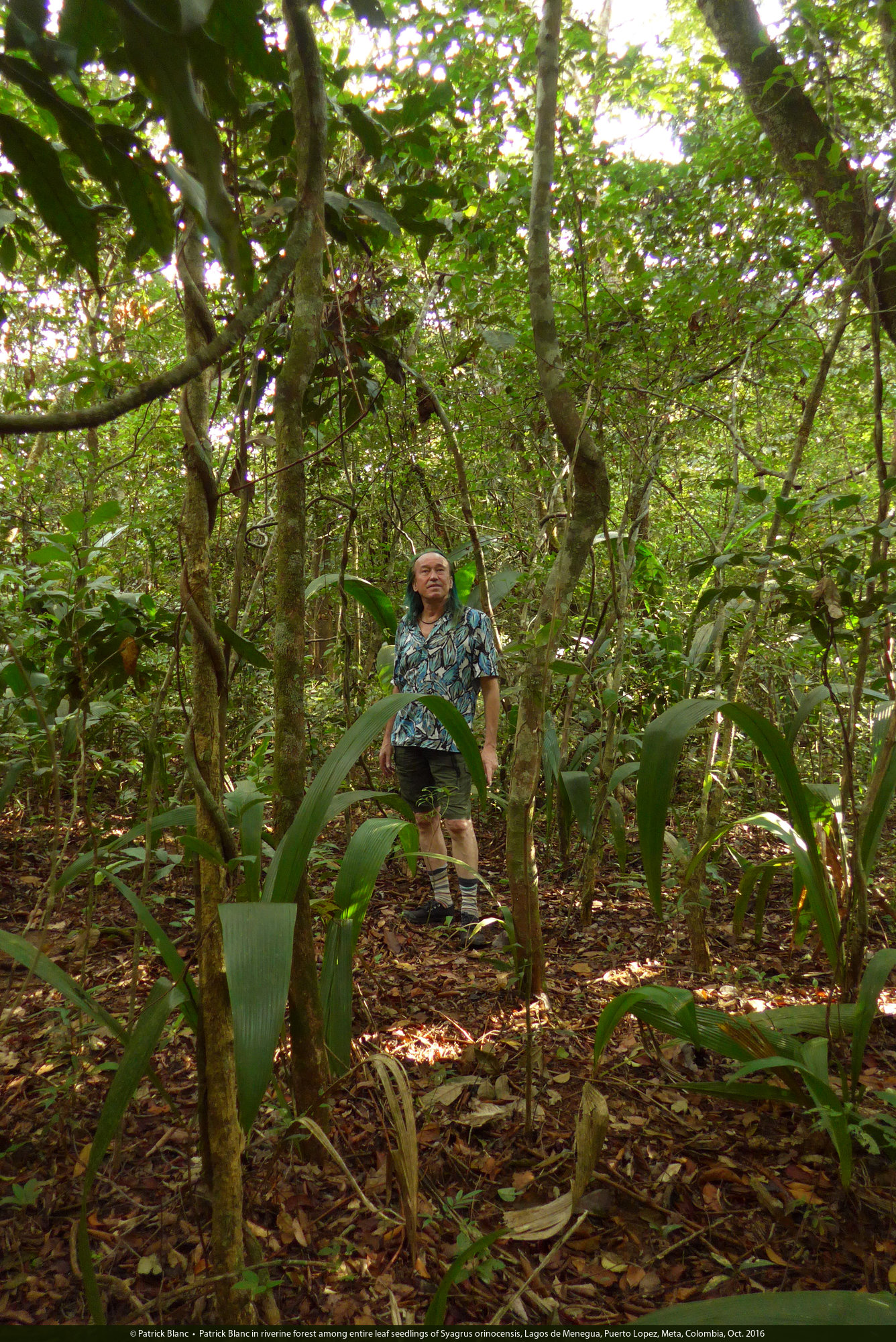 Patrick Blanc in riverine forest among entire leaf seedlings of Syagrus orinocensis, Lagos de Menegua, Puerto Lopez, Meta, Colombia, Oct. 2016