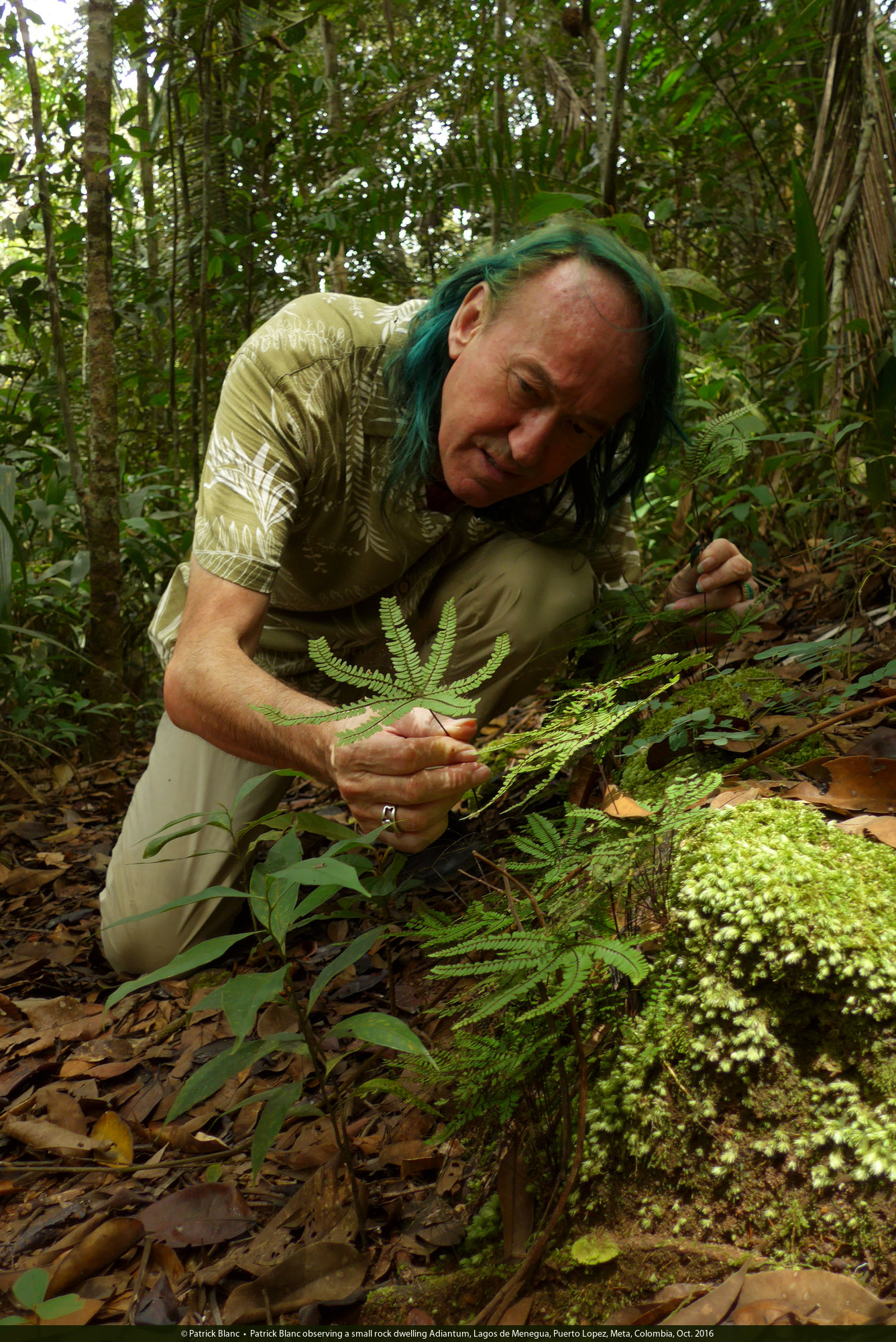 Patrick Blanc observing a small rock dwelling Adiantum, Lagos de Menegua, Puerto Lopez, Meta, Colombia, Oct. 2016
