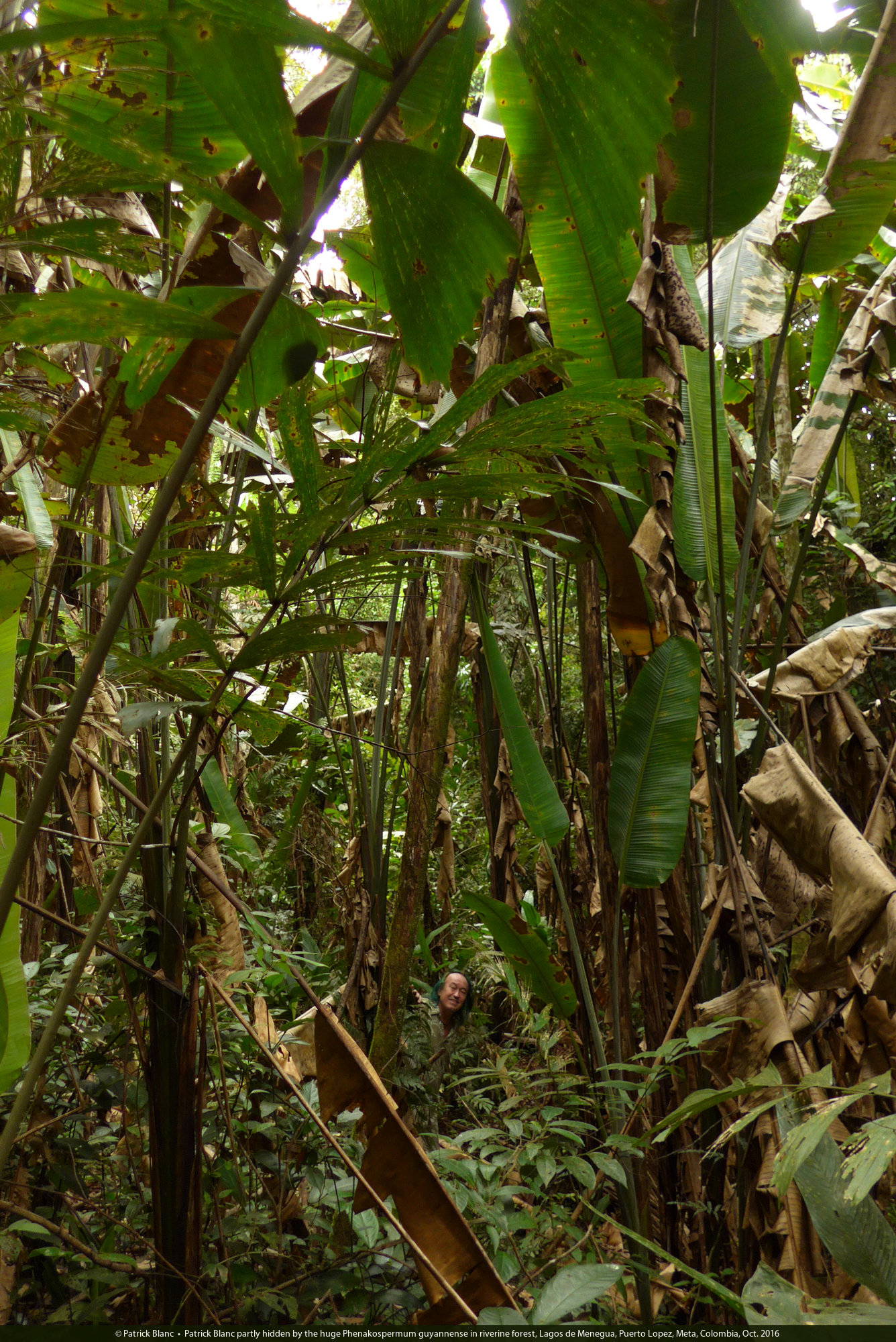 Patrick Blanc partly hidden by the huge Phenakospermum guyannense in riverine forest, Lagos de Menegua, Puerto Lopez, Meta, Colombia, Oct. 2016