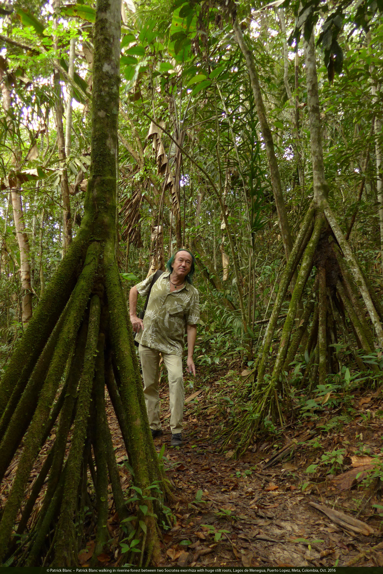 Patrick Blanc walking in riverine forest between two Socratea exorrhiza with huge stilt roots, Lagos de Menegua, Puerto Lopez, Meta, Colombia, Oct. 2016