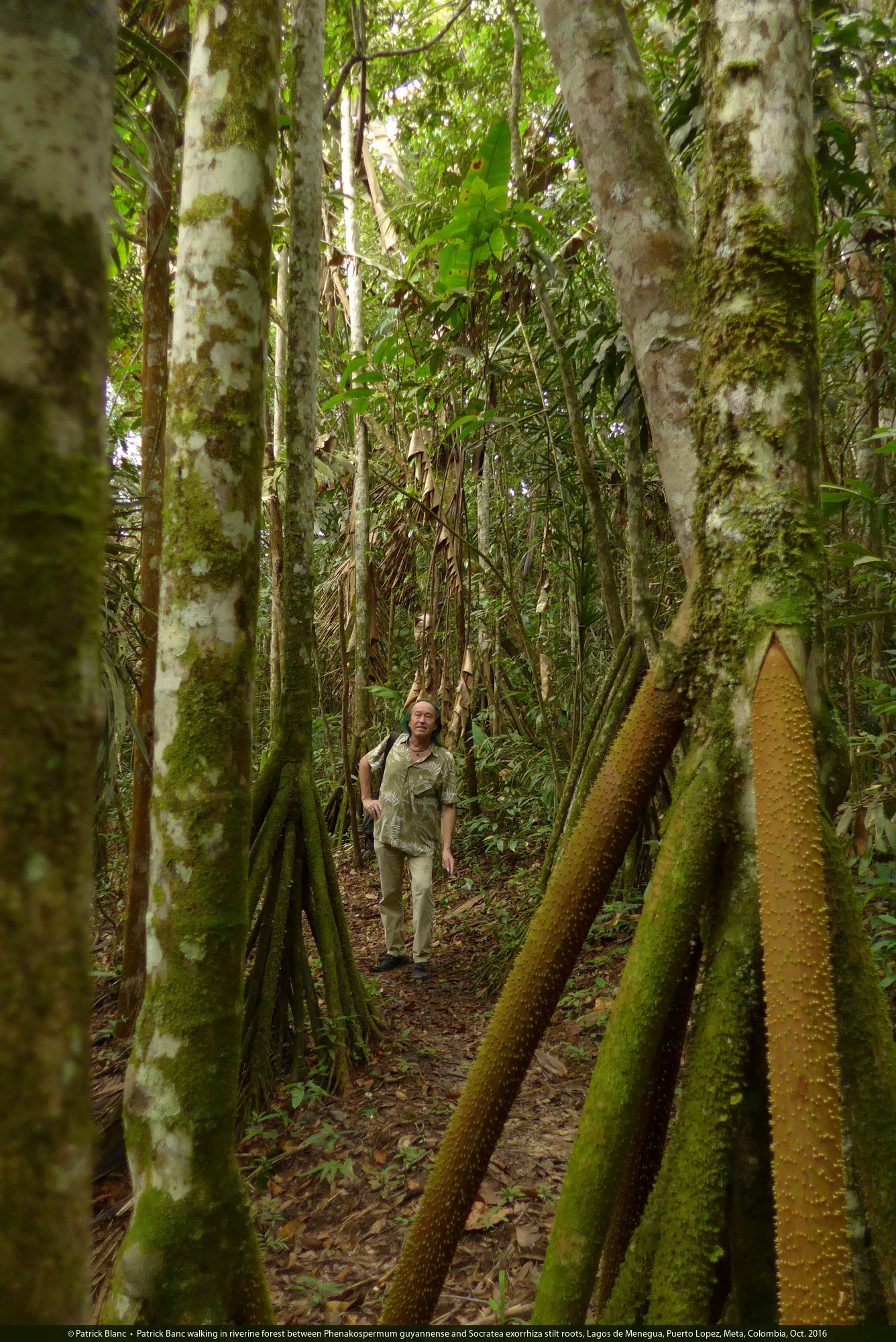 Patrick Banc walking in riverine forest between Phenakospermum guyannense and Socratea exorrhiza stilt roots, Lagos de Menegua, Puerto Lopez, Meta, Colombia, Oct. 2016