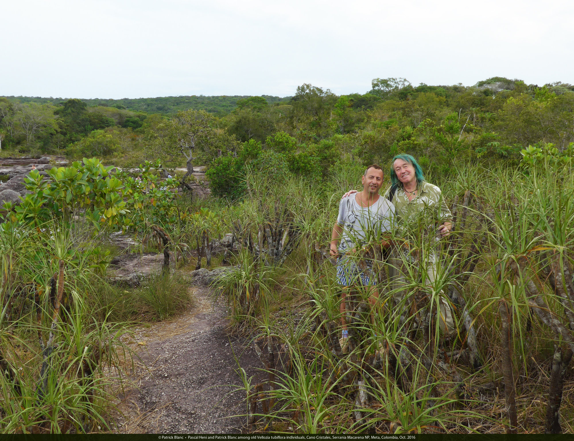 Pascal Heni and Patrick Blanc among old Vellozia tubiflora individuals, Cano Cristales, Serrania Macarena NP, Meta, Colombia, Oct. 2016