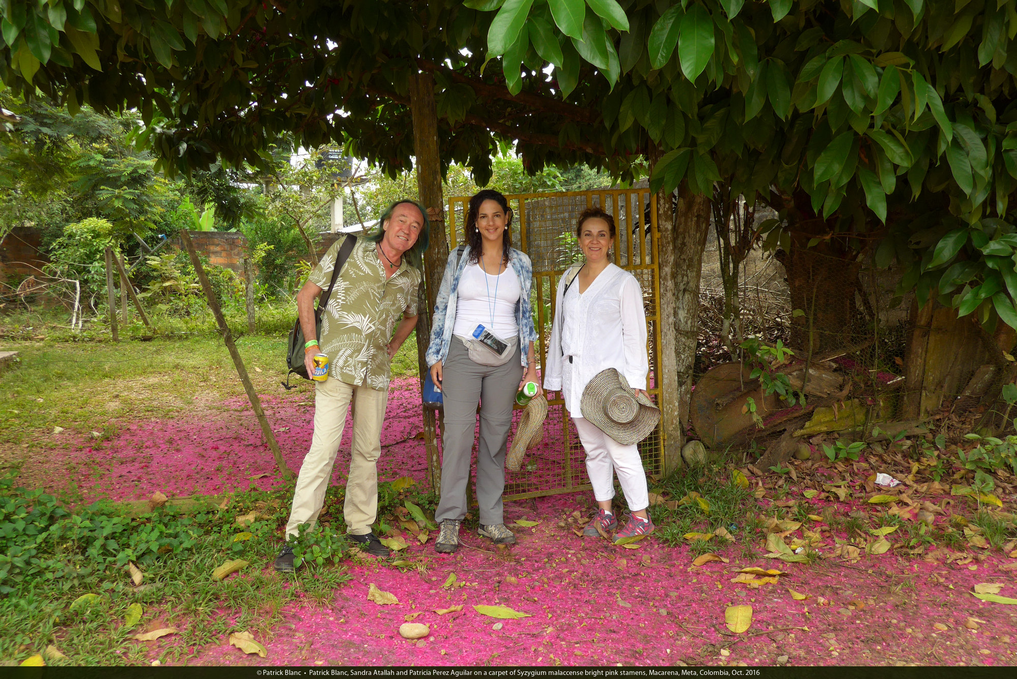 Patrick Blanc, Sandra Atallah and Patricia Perez Aguilar on a carpet of Syzygium malaccense bright pink stamens, Macarena, Meta, Colombia, Oct. 2016