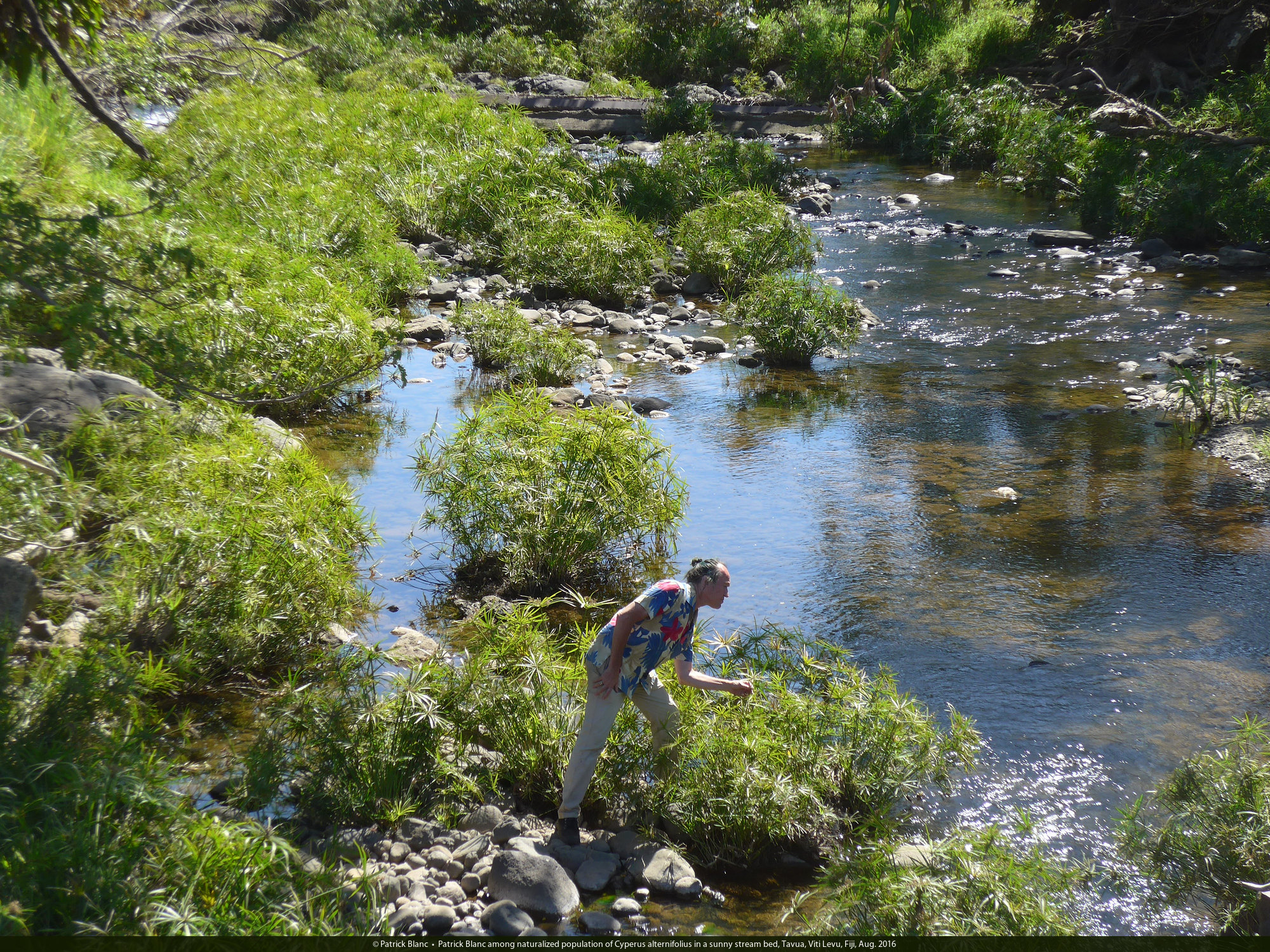 Patrick Blanc among naturalized population of Cyperus alternifolius in a sunny stream bed, Tavua, Viti Levu, Fiji, Aug. 2016
