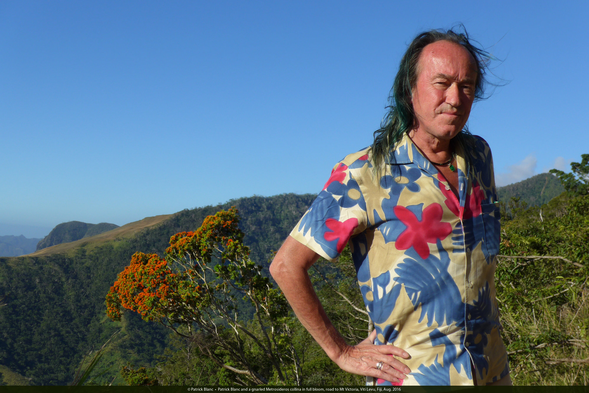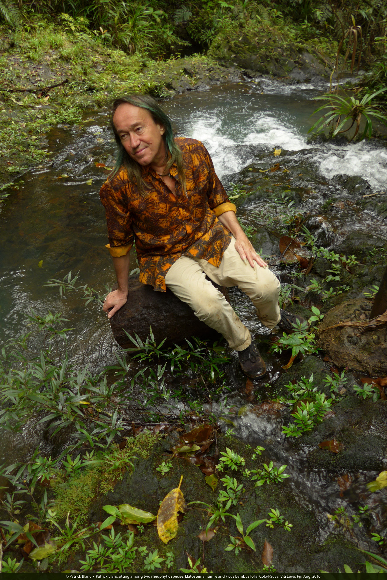 Patrick Blanc at the base of a permanently seeping rock covered in mosses, Suva, Viti Levu, Fiji, Aug. 2016