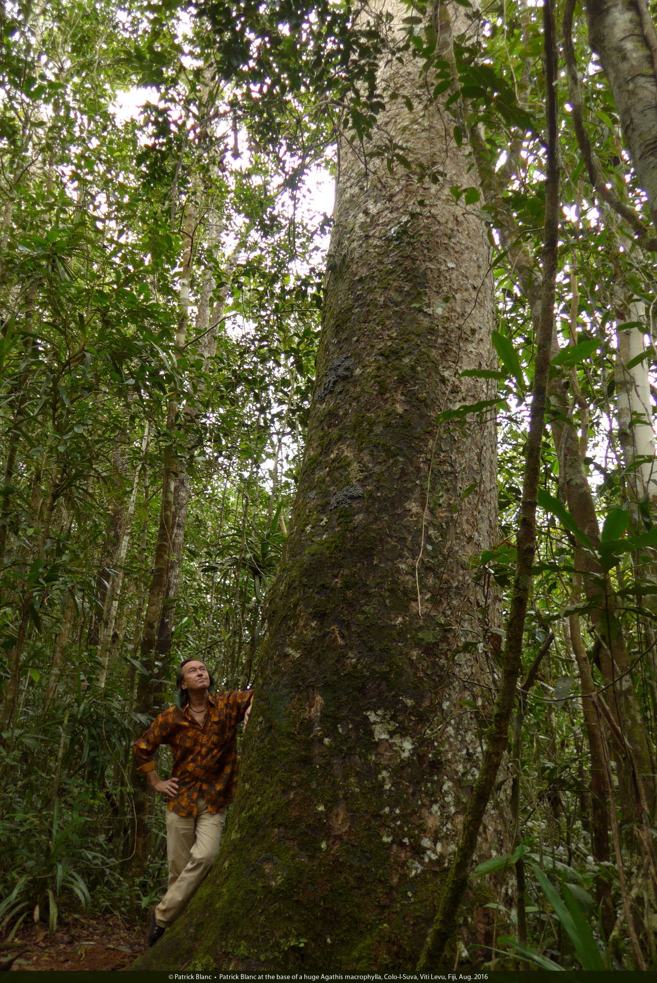 Patrick Blanc at the base of a huge Agathis macrophylla, Colo-I-Suva, Viti Levu, Fiji, Aug. 2016