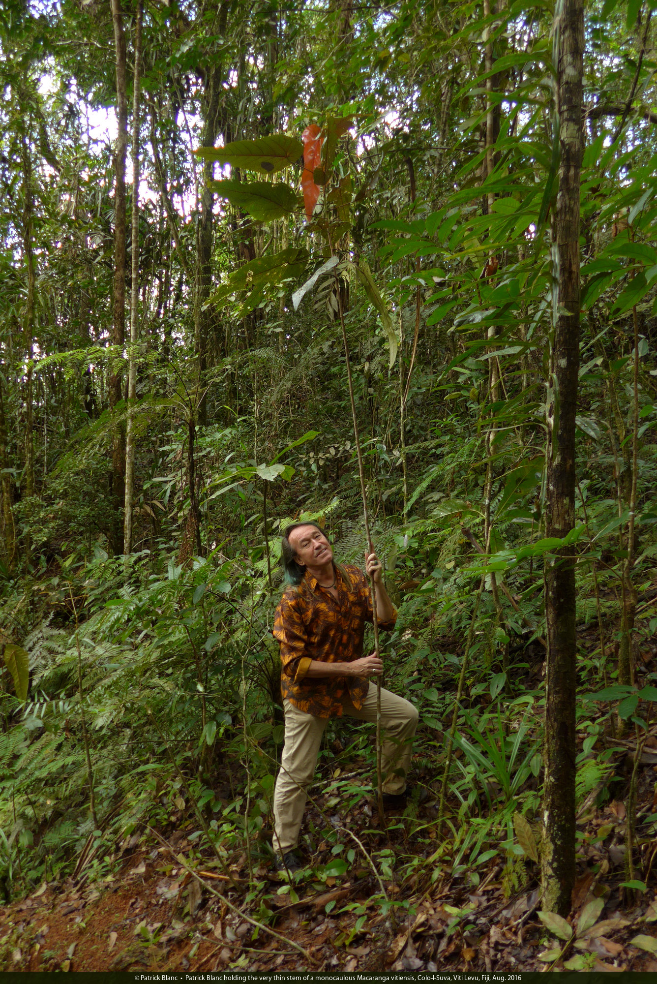 Patrick Blanc holding the very thin stem of a monocaulous Macaranga vitiensis, Colo-I-Suva, Viti Levu, Fiji, Aug. 2016