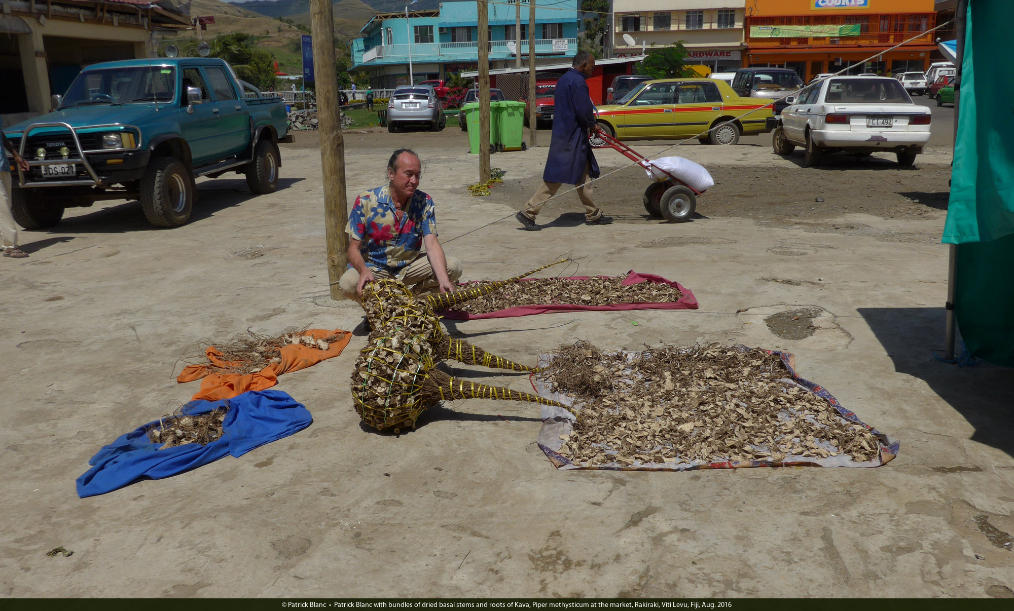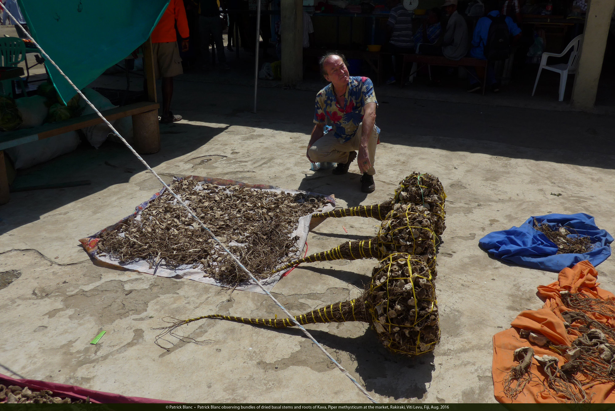 Patrick Blanc with bundles of dried basal stems and roots of Kava, Piper methysticum at the market, Rakiraki, Viti Levu, Fiji, Aug. 2016