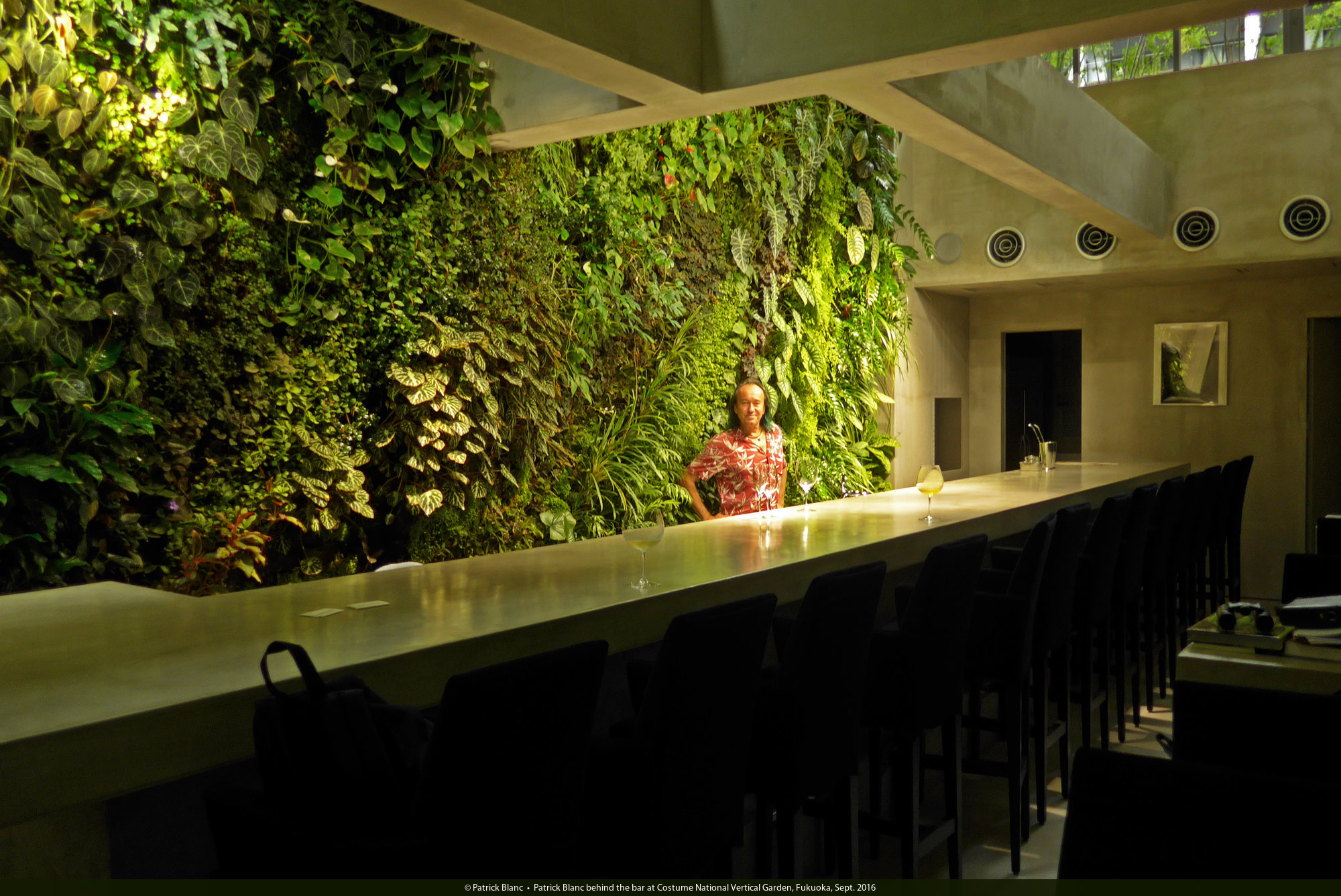 Patrick Blanc behind the bar at Costume National Vertical Garden, Fukuoka, Sept. 2016