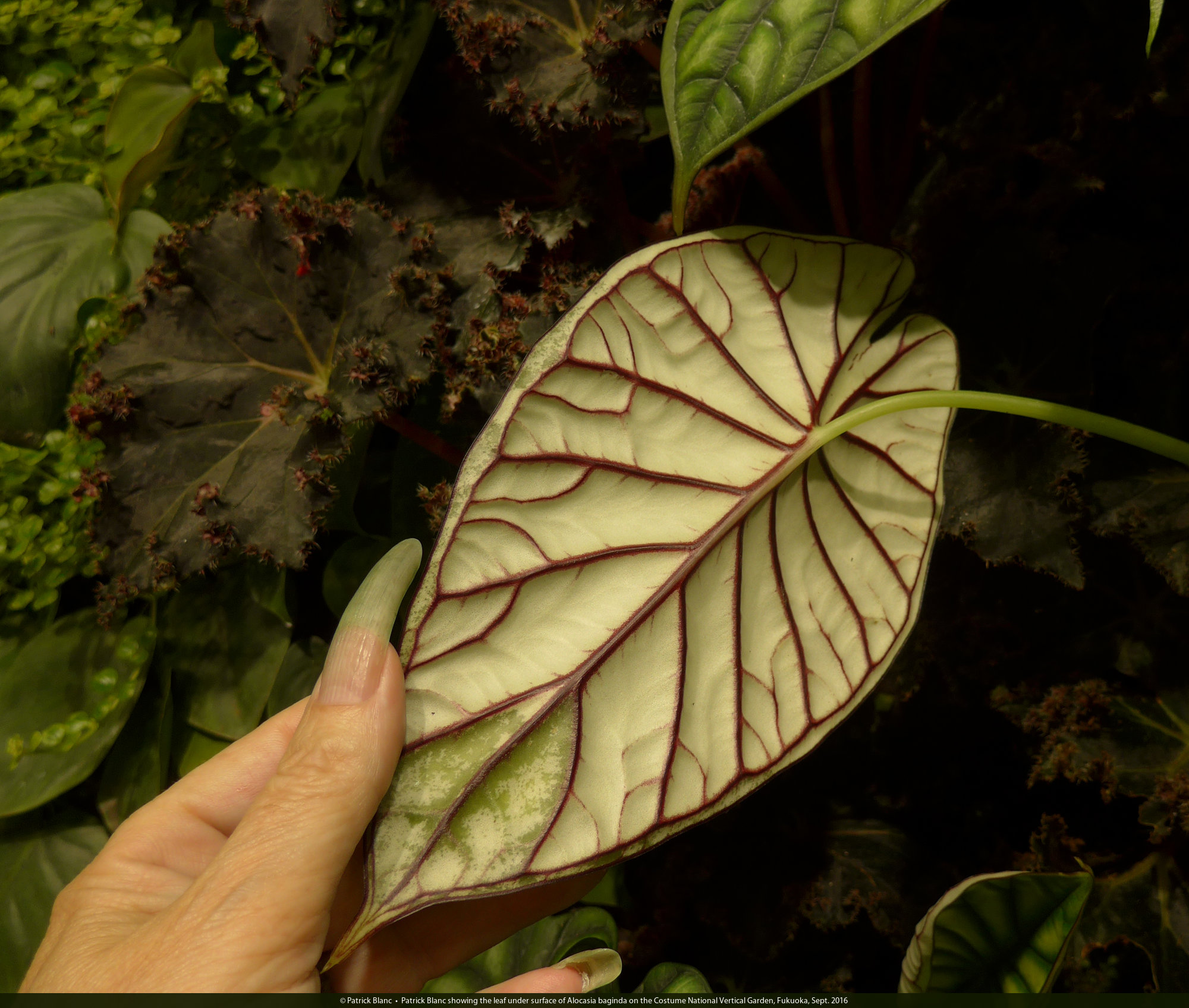 Patrick Blanc showing the leaf under surface of Alocasia baginda on the Costume National Vertical Garden, Fukuoka, Sept. 2016