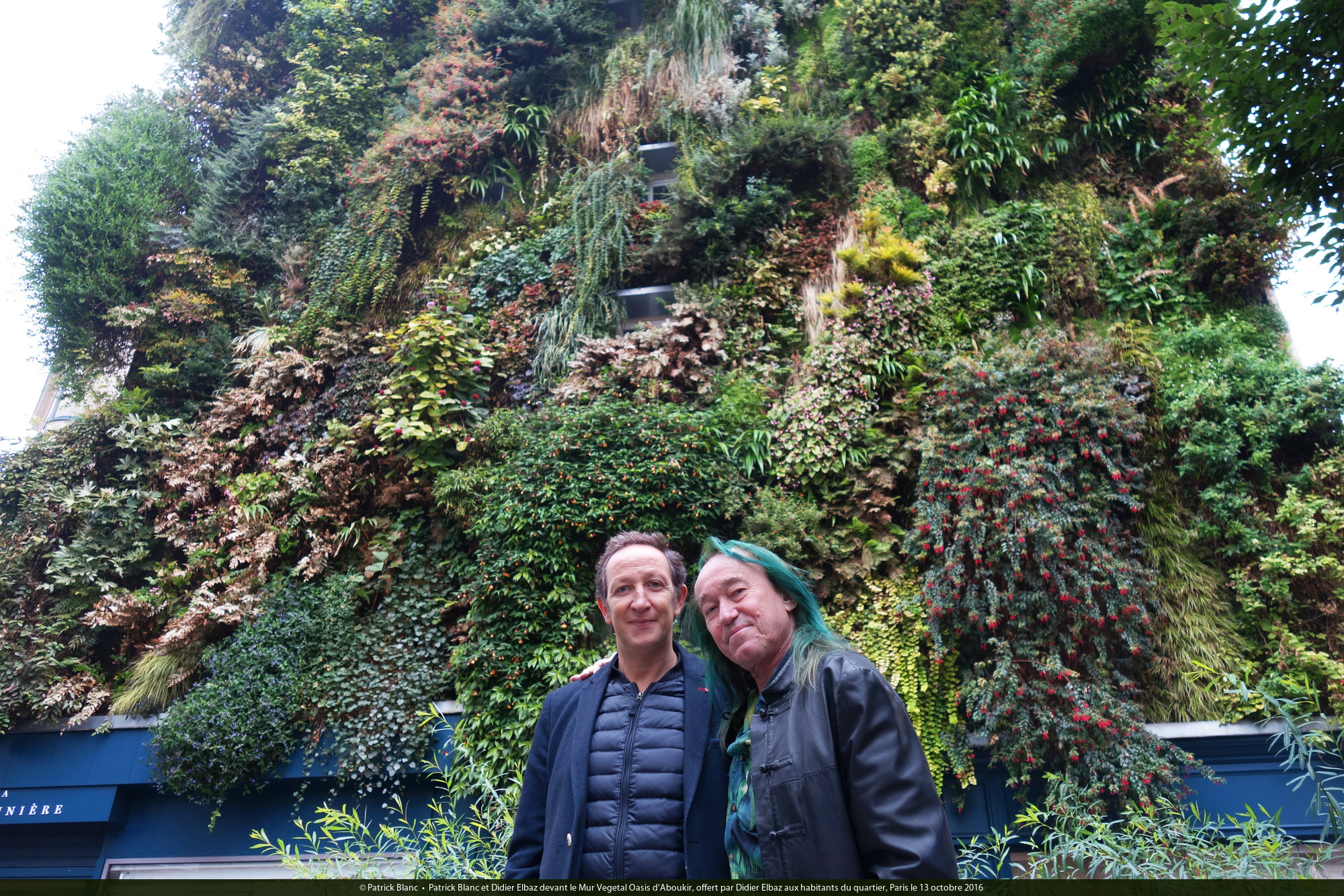 Patrick Blanc et Didier Elbaz devant le Mur Vegetal Oasis d'Aboukir, offert par Didier Elbaz aux habitants du quartier, Paris le 13 octobre 2016