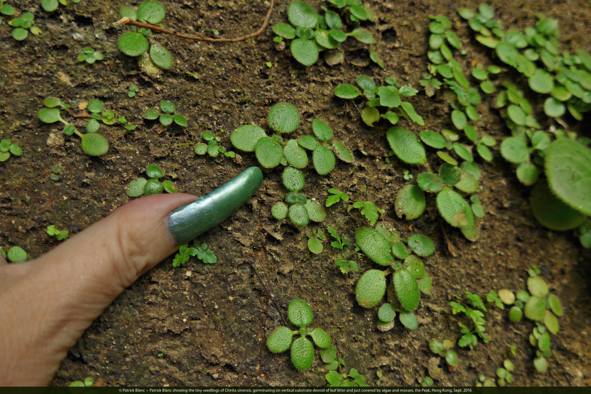 Patrick Blanc showing the tiny seedlings of Chirita sinensis, germinating on vertical substrate devoid of leaf litter and just covered by algae and mosses, the Peak, Hong Kong, Sept. 2016