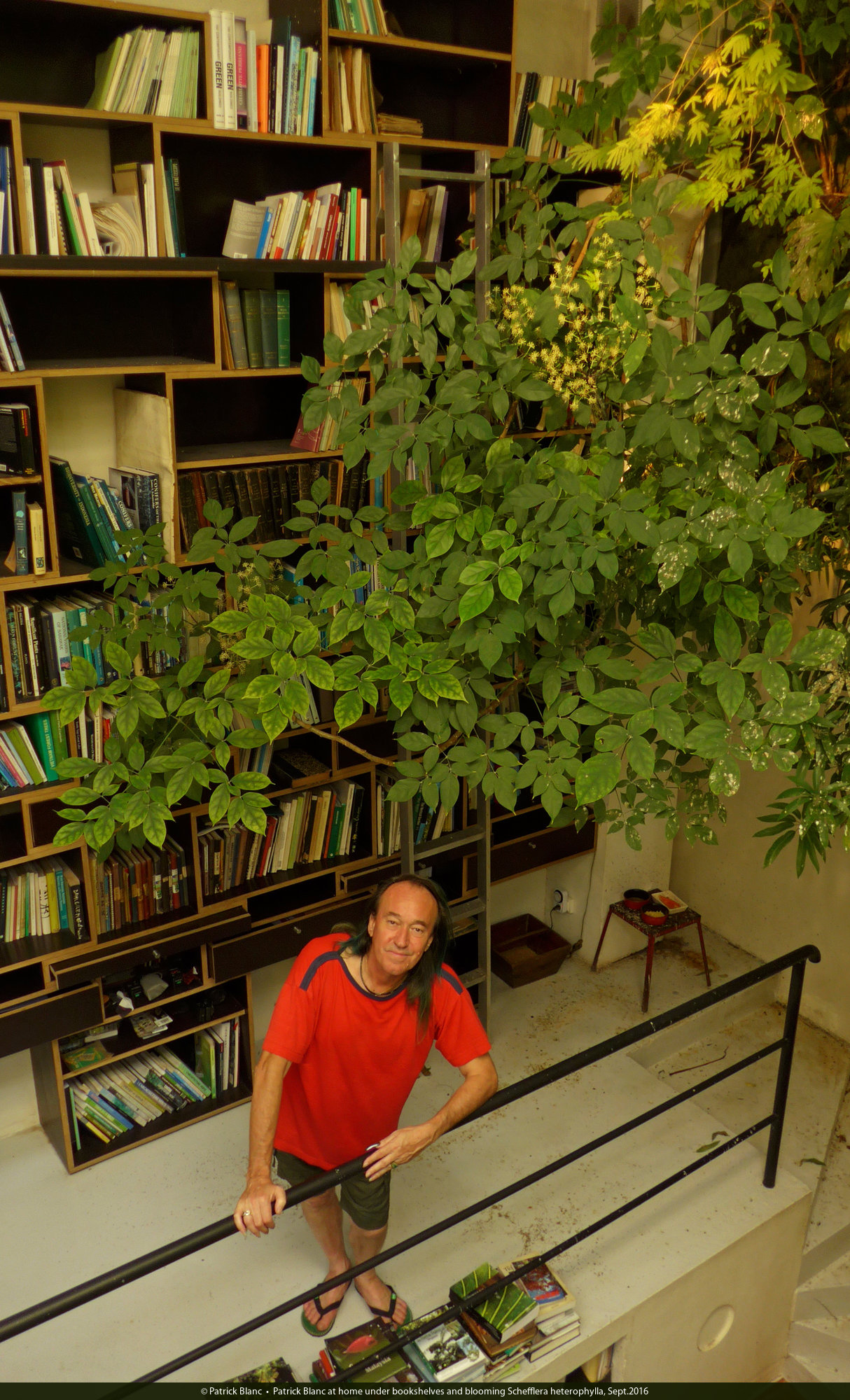 Patrick Blanc at home under bookshelves and blooming Heptapleurum (syn. Schefflera) heterophyllum, Sept.2016
