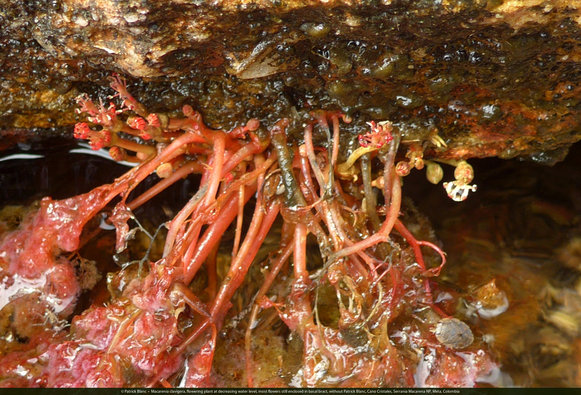 Patrick Blanc on slabs above a dense population of the deep red Macarenia clavigera, Cano Cristales, Serrania Macarena NP, Meta, Colombia, Oct. 2016