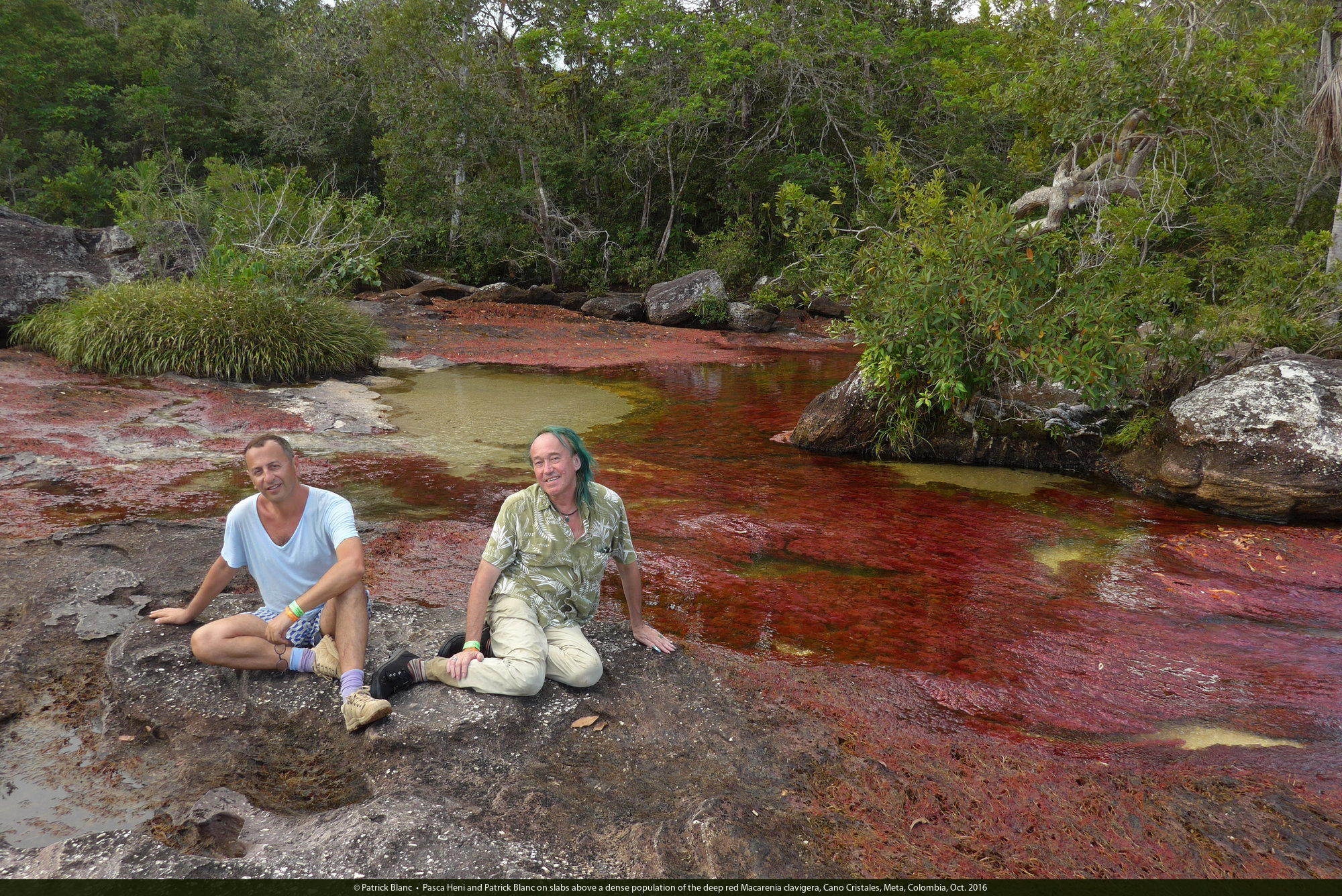 Pasca Heni and Patrick Blanc on slabs above a dense population of the deep red Macarenia clavigera, Cano Cristales, Meta, Colombia, Oct. 2016