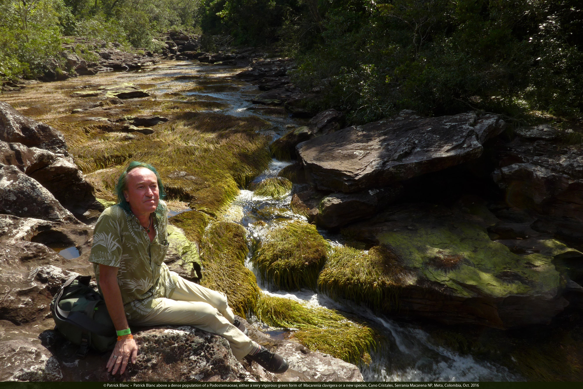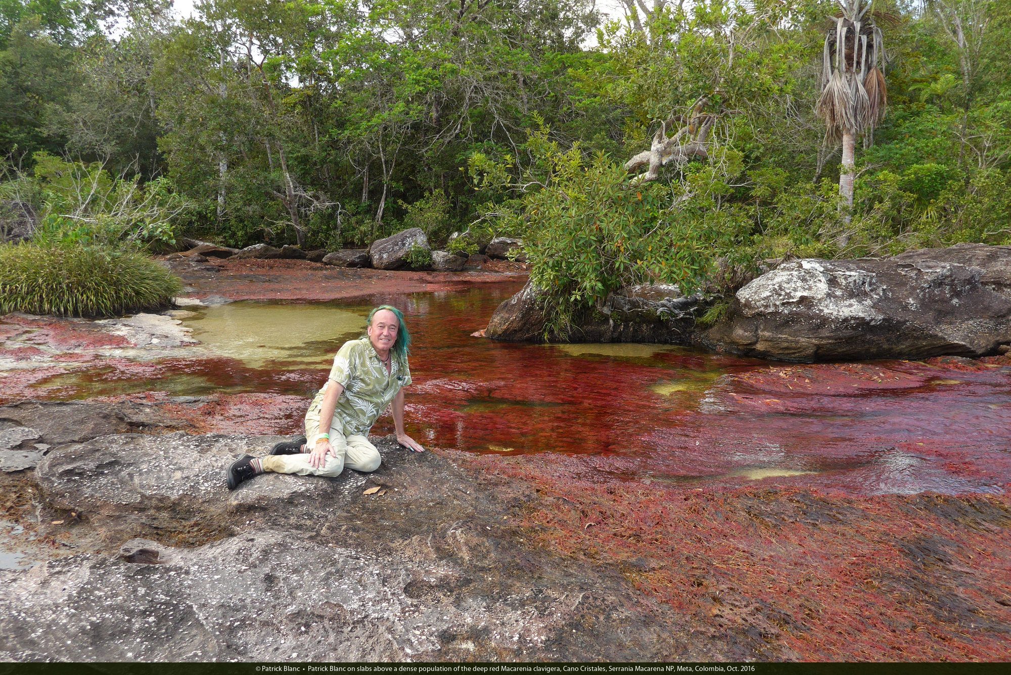Patrick Blanc above a dense population of the deep red Macarenia clavigera, Cano Cristales, Serrania Macarena NP, Meta, Colombia, Oct. 2016