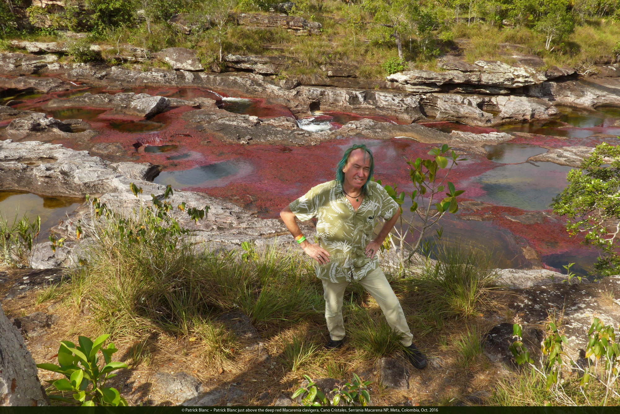 Patrick Blanc just above the deep red Macarenia clavigera, Cano Cristales, Serrania Macarena NP, Meta, Colombia, Oct. 2016