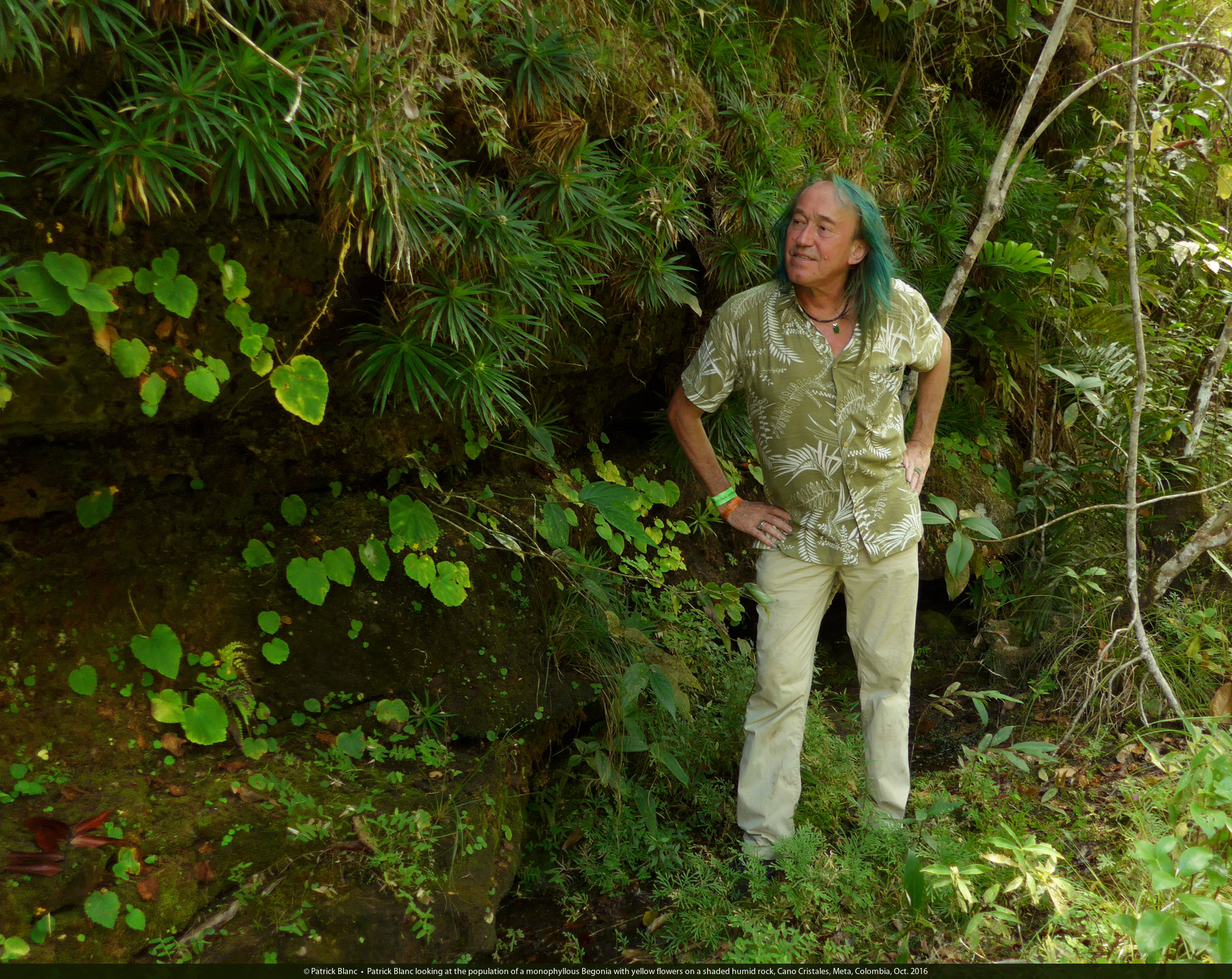 Patrick Blanc looking at the population of a monophyllous Begonia with yellow flowers on a shaded humid rock, Cano Cristales, Meta, Colombia, Oct. 2016