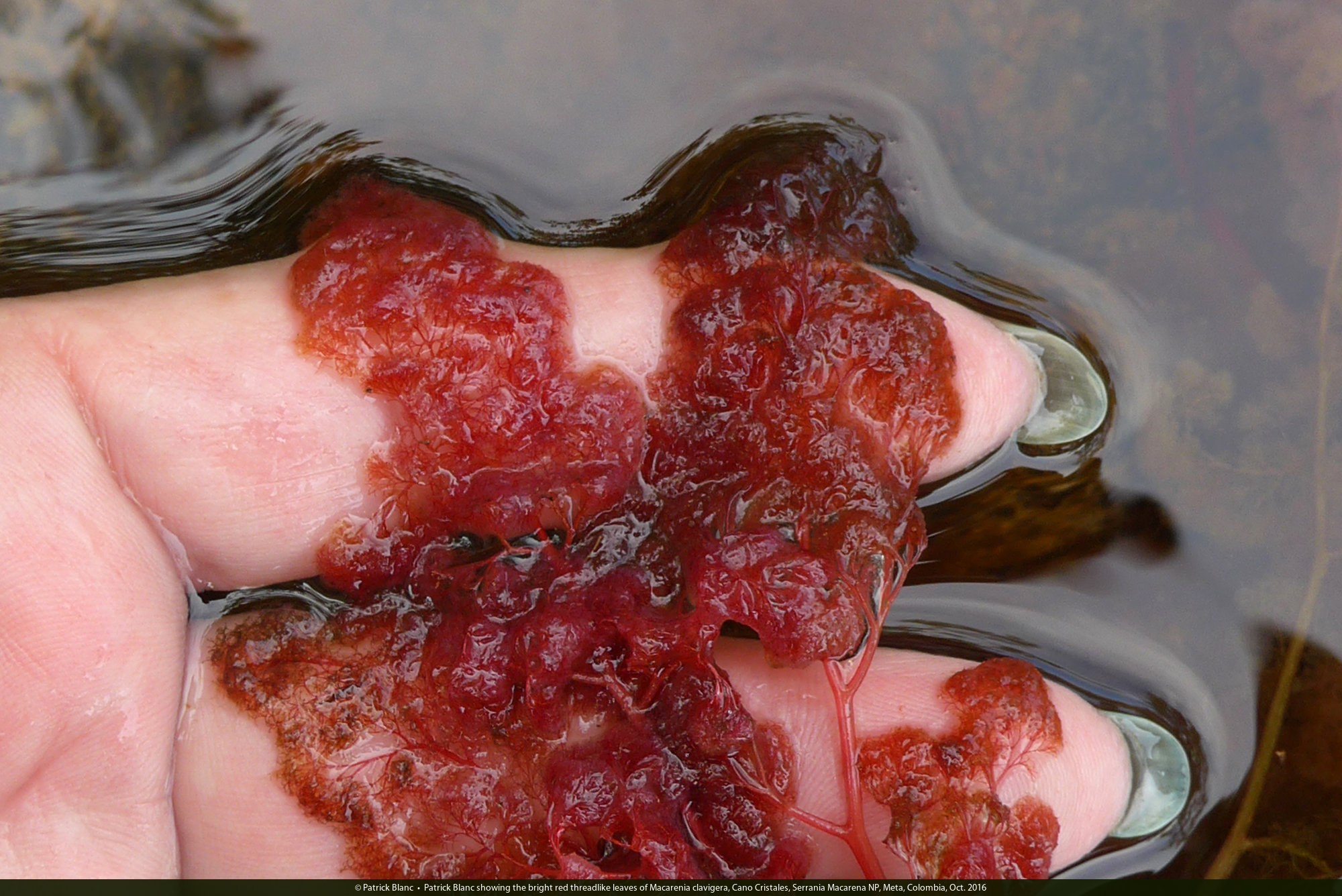 Patrick Blanc showing the bright red threadlike tips of the leaves of Macarenia clavigera, Cano Cristales, Serrania Macarena NP, Meta, Colombia, Oct. 2016