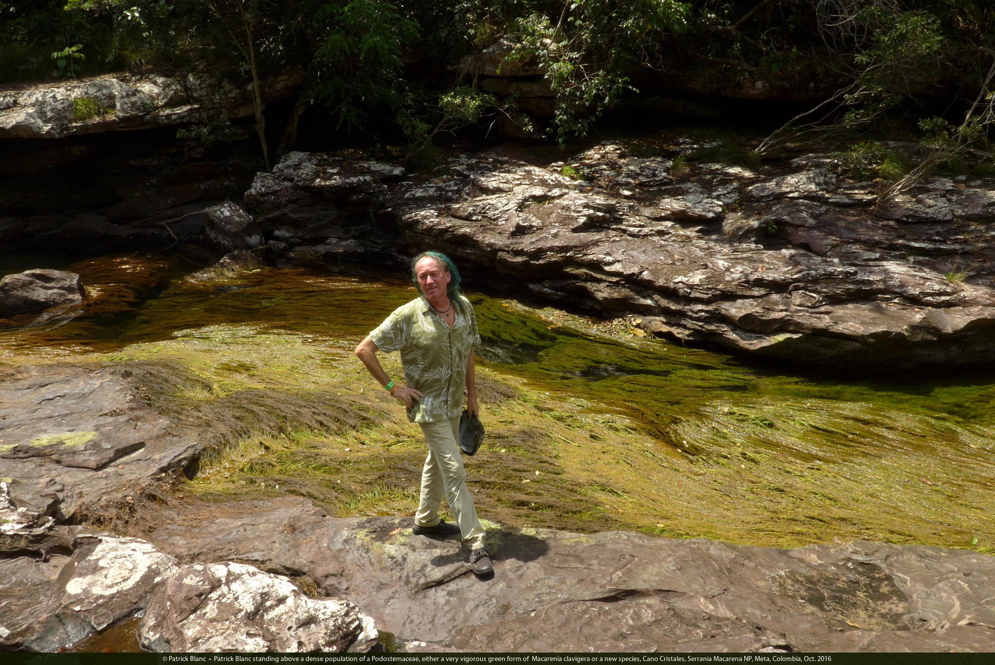 Patrick Blanc standing above a dense population of a Podostemaceae, either a very vigorous green form of Macarenia clavigera or a new species, Cano Cristales, Serrania Macarena NP, Meta, Colombia, Oct. 2016