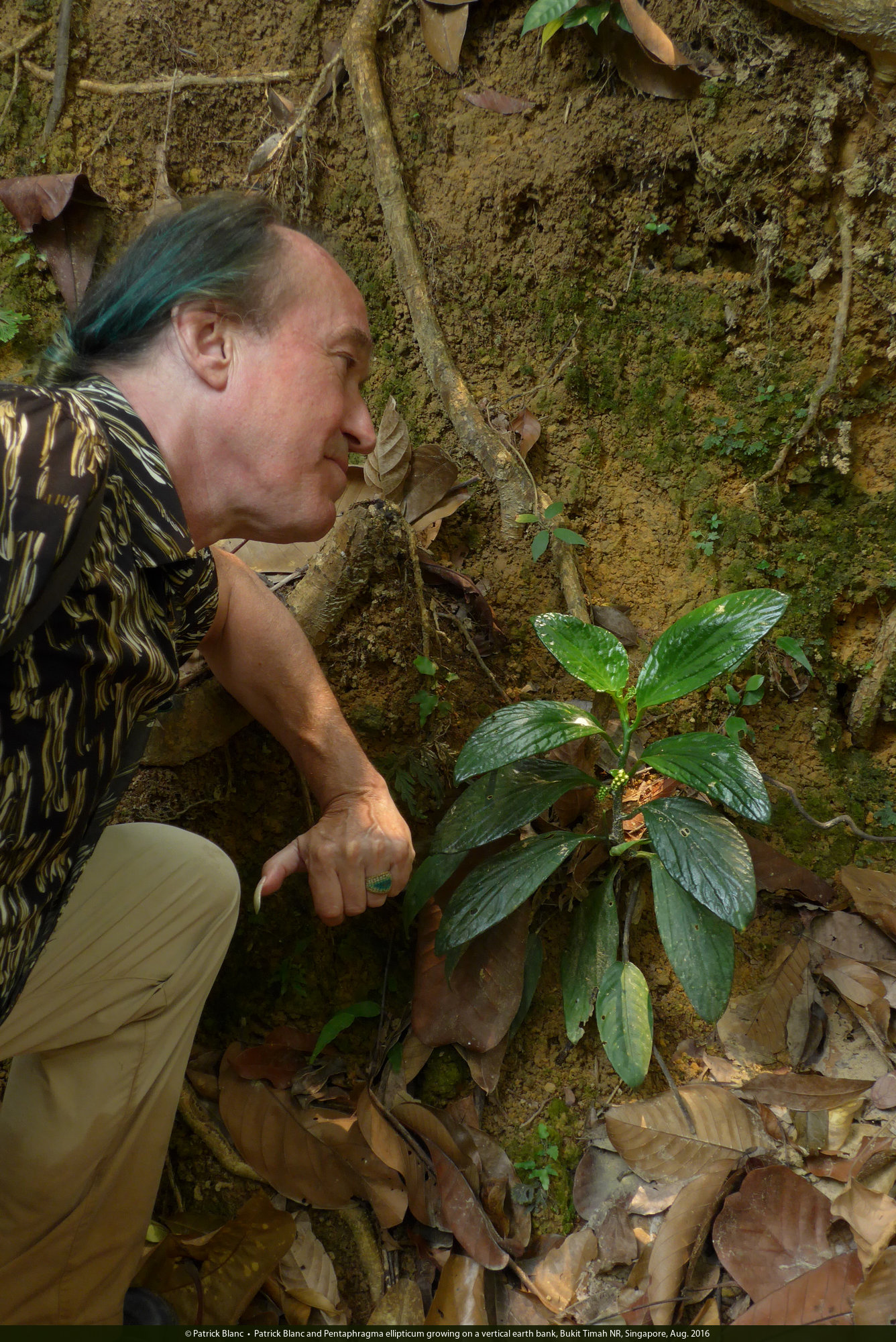 Patrick Blanc and Pentaphragma ellipticum growing on a vertical earth bank, Bukit Timah NR, Singapore, Aug. 2016