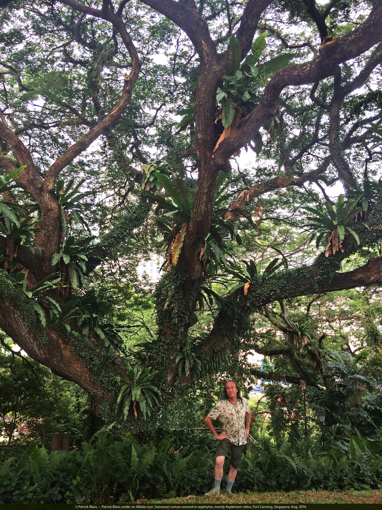 Patrick Blanc under an Albizia (syn. Samanea) saman covered in epiphytes, mostly Asplenium nidus, Fort Canning, Singapore, Aug. 2016