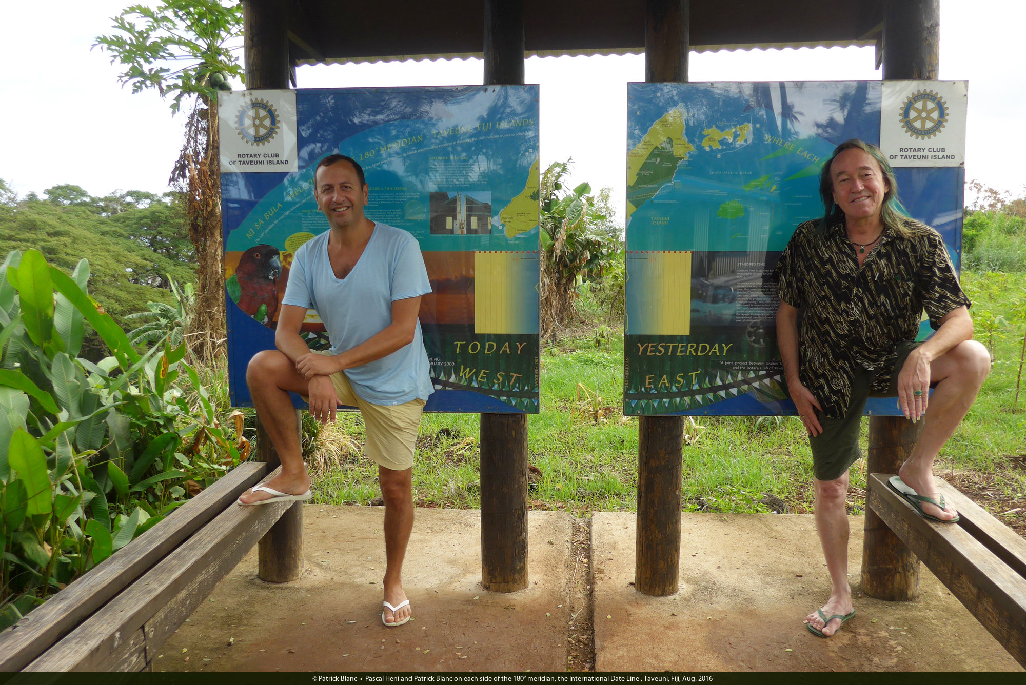 Pascal Heni and Patrick Blanc on each side of the 180° meridian, the International Date Line , Taveuni, Fiji, Aug. 2016