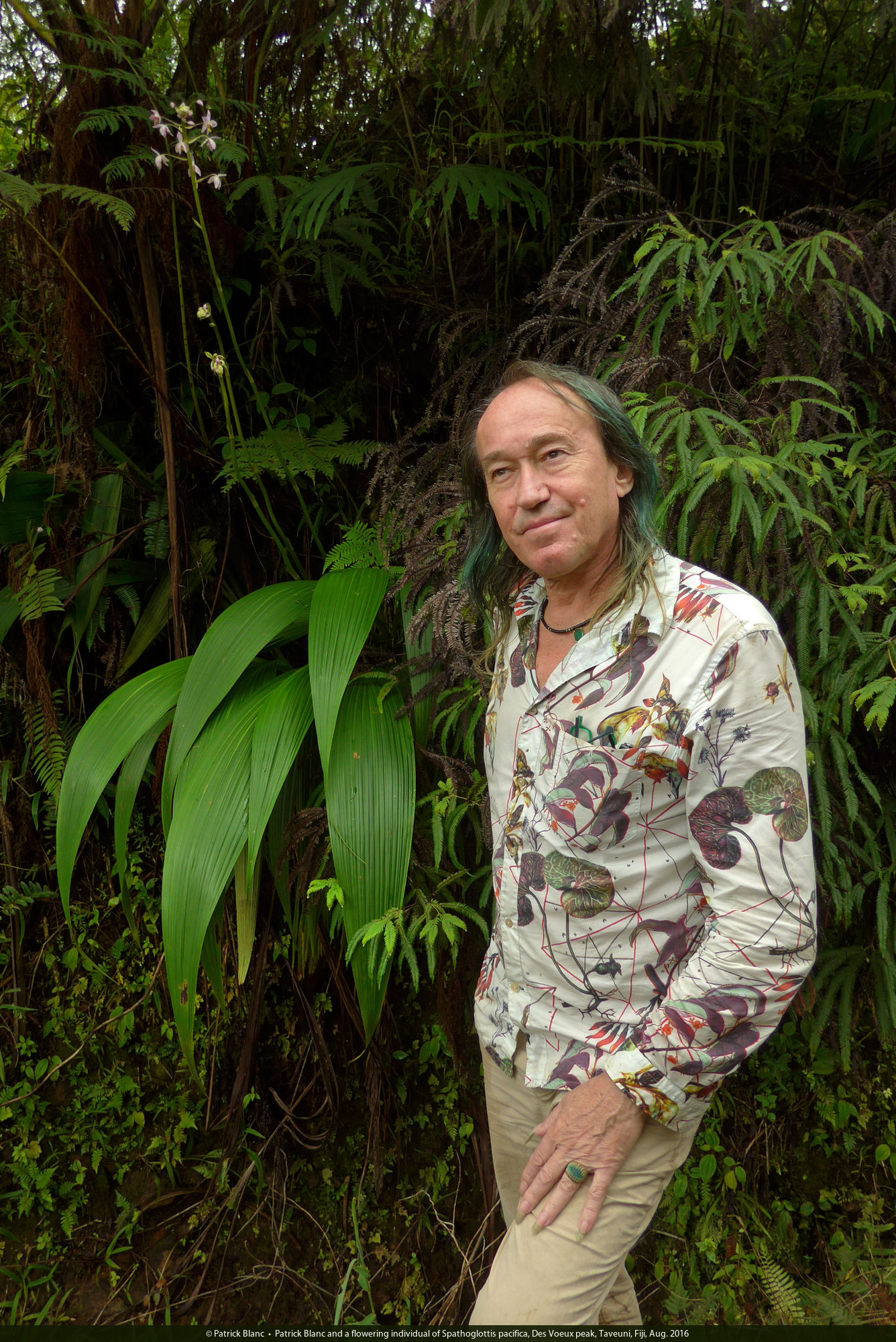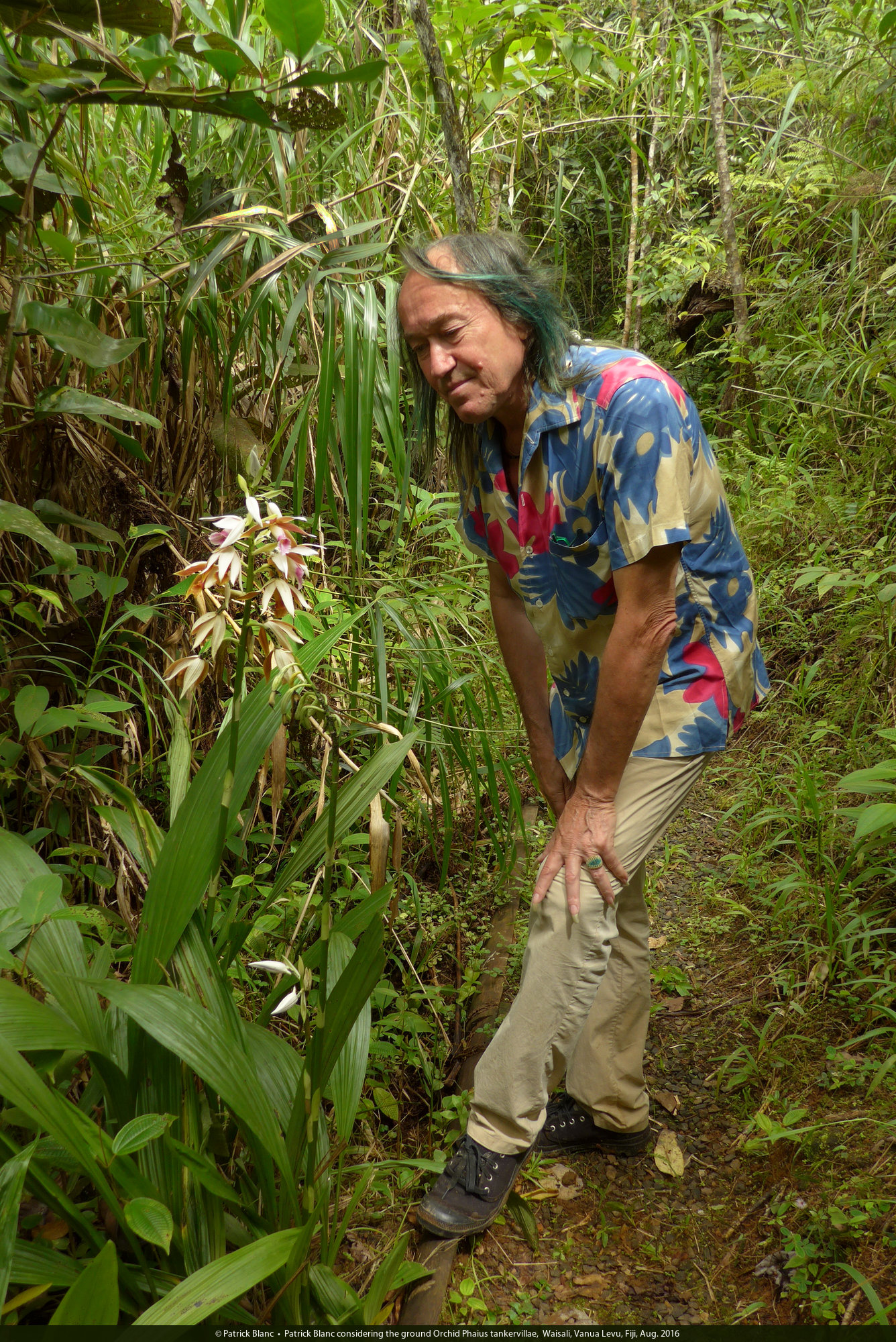 Patrick Blanc considering the ground Orchid Phaius tankervillae, Waisali, Vanua Levu, Fiji, Aug. 2016