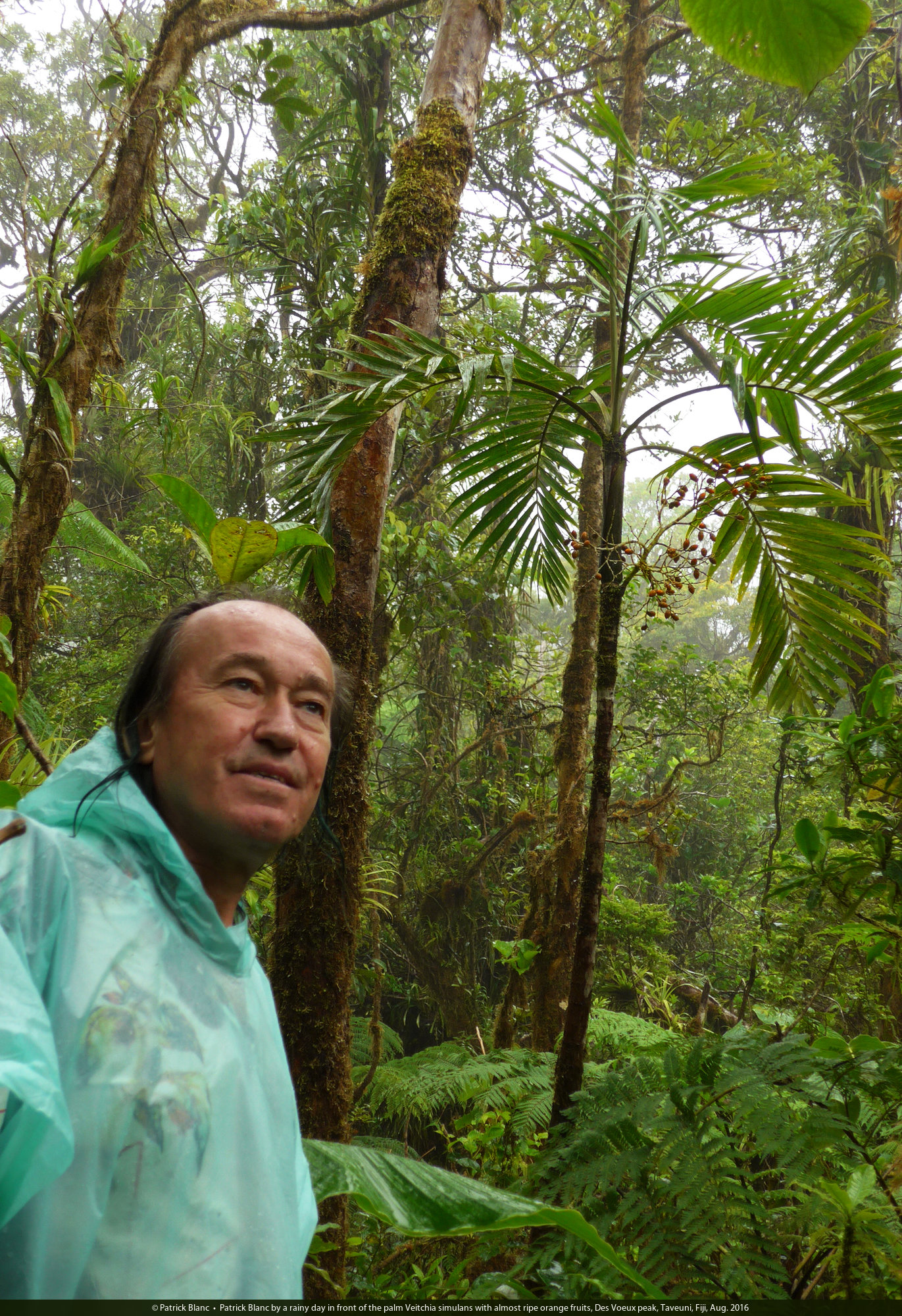 Patrick Blanc by a usual rainy day in front of the palm Veitchia simulans, Des Voeux peak, Taveuni, Fiji, Aug. 2016