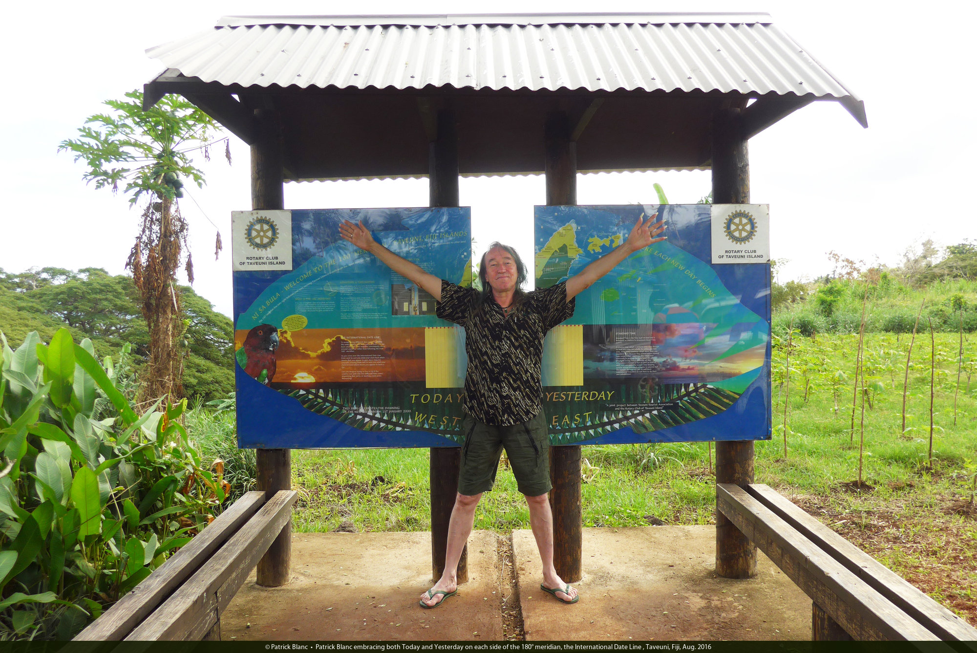 Patrick Blanc embracing both Today and Yesterday on each side of the 180° meridian, the International Date Line , Taveuni, Fiji, Aug. 2016