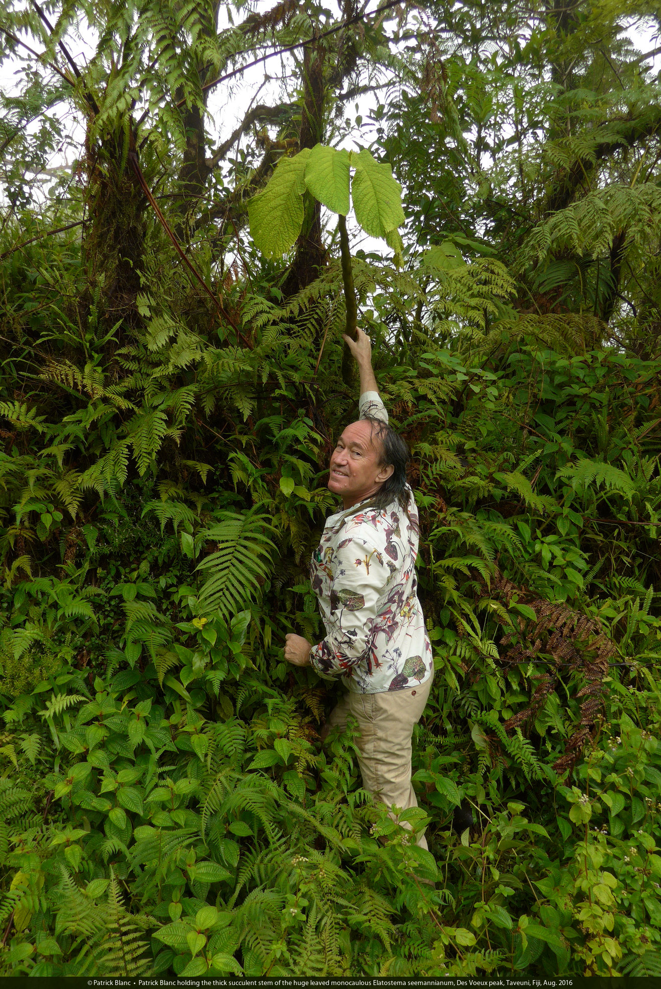 Patrick Blanc holding the thick succulent stem of the huge leaved monocaulous Elatostema seemannianum, Des Voeux peak, Taveuni, Fiji, Aug. 2016