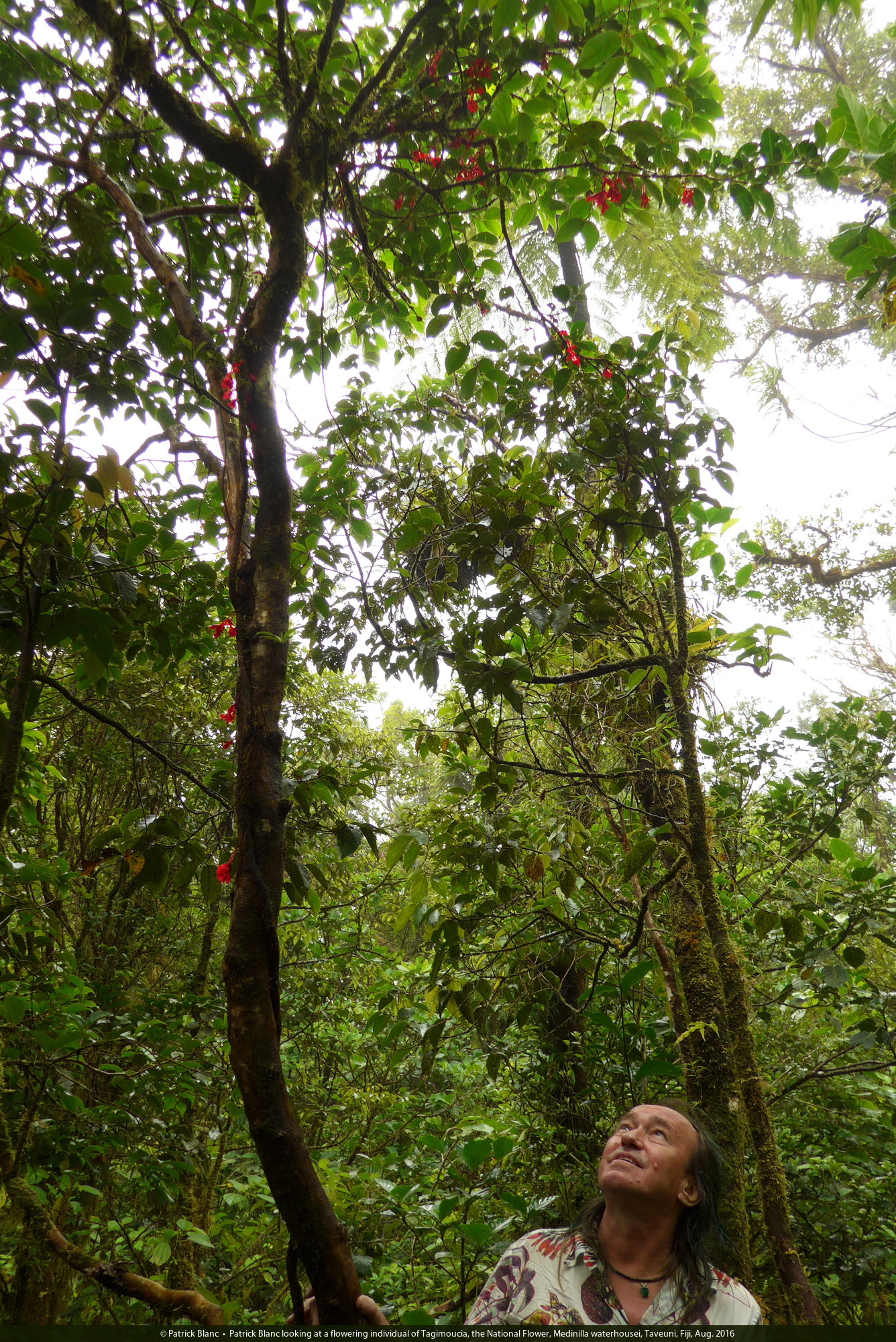 Patrick Blanc among leaf litter flowering branches of Syzygium gracilipes, Colo-I-Suva, Viti Levu, Fiji, Aug. 2016