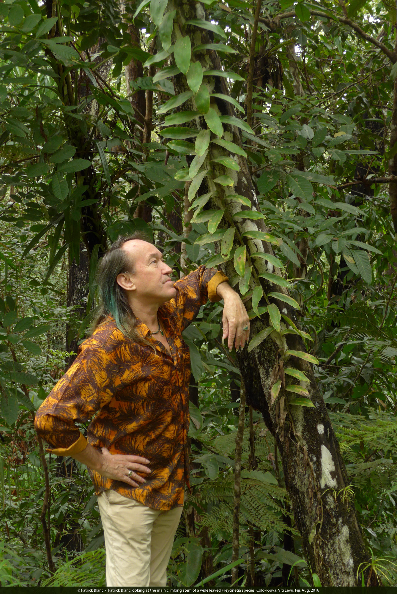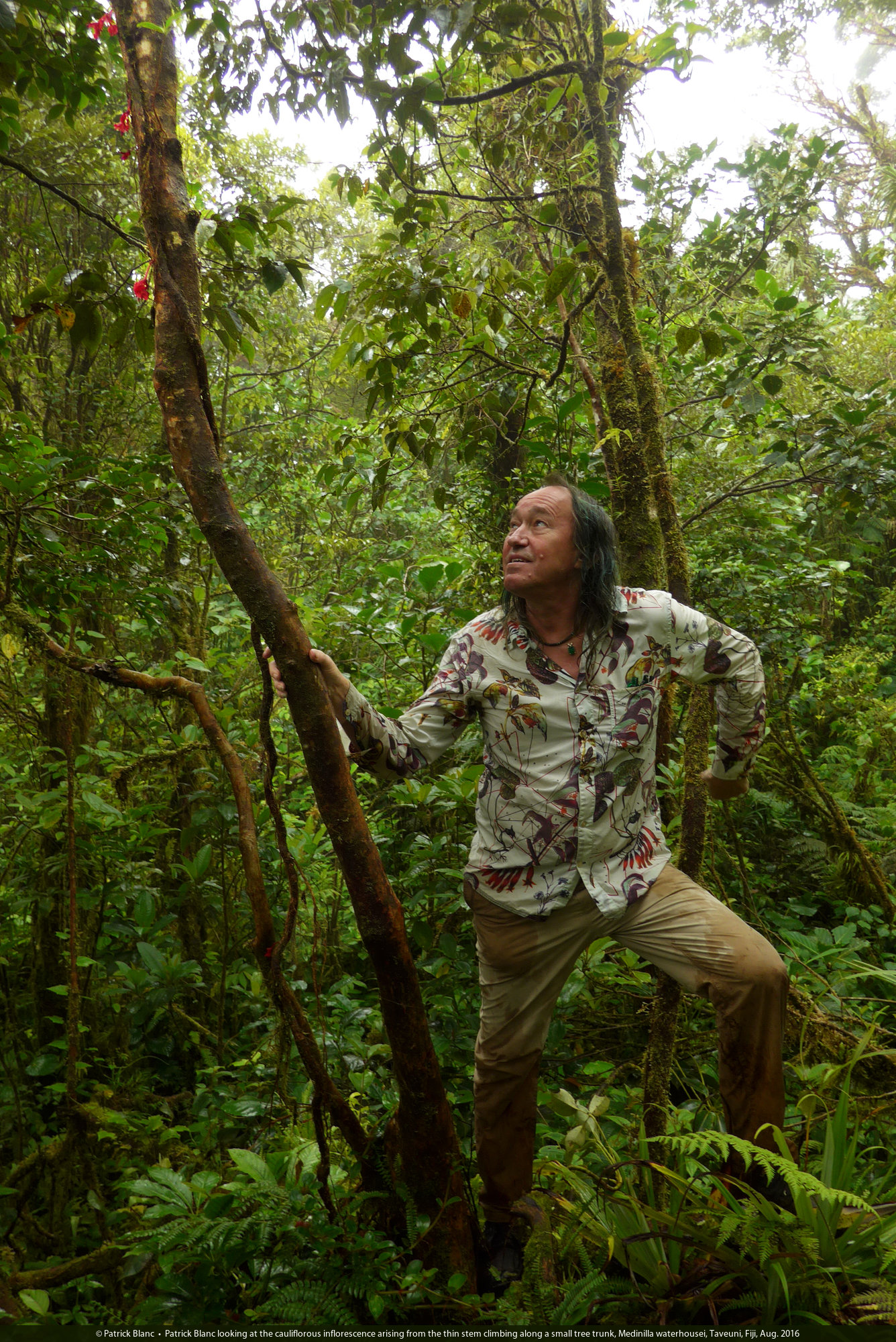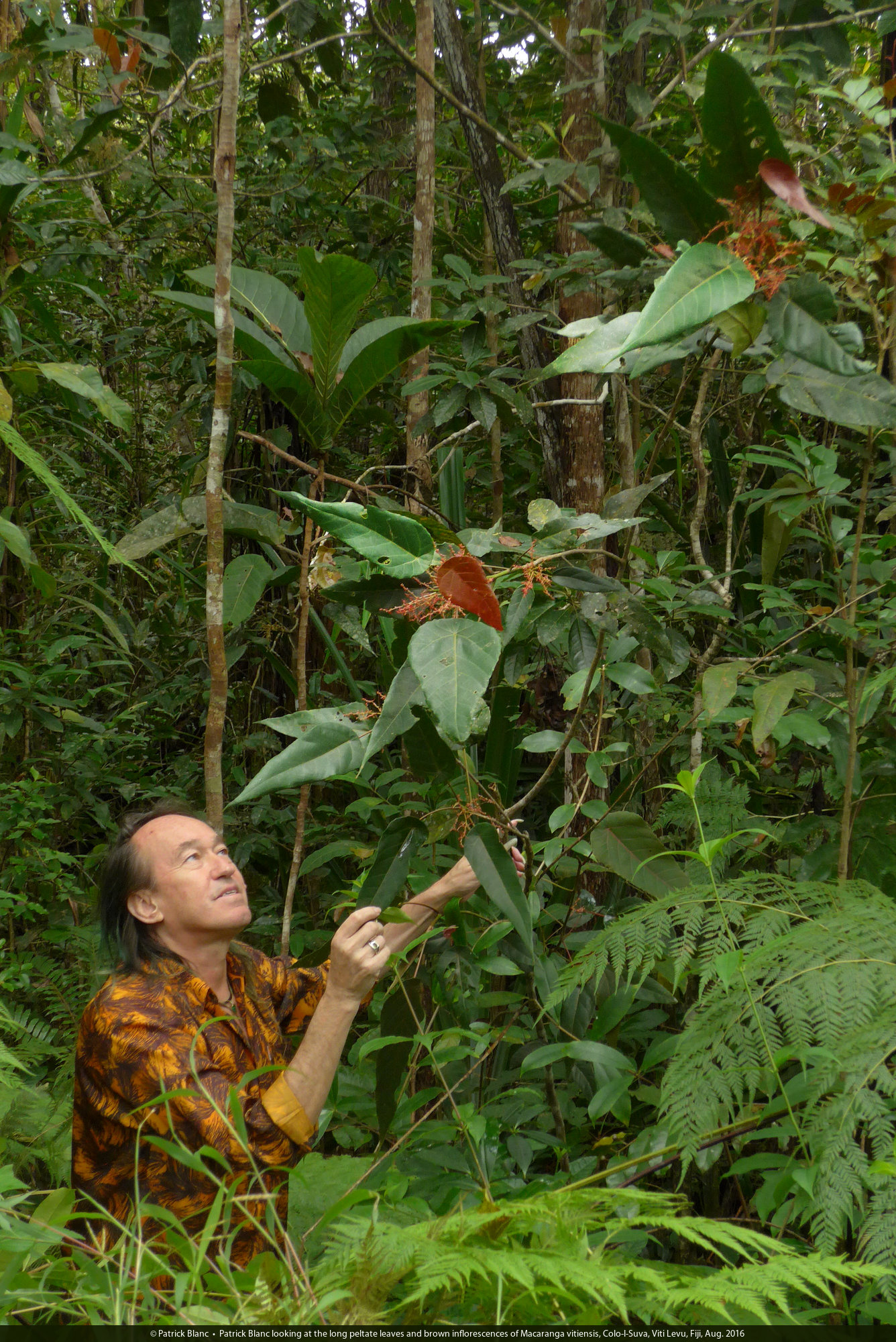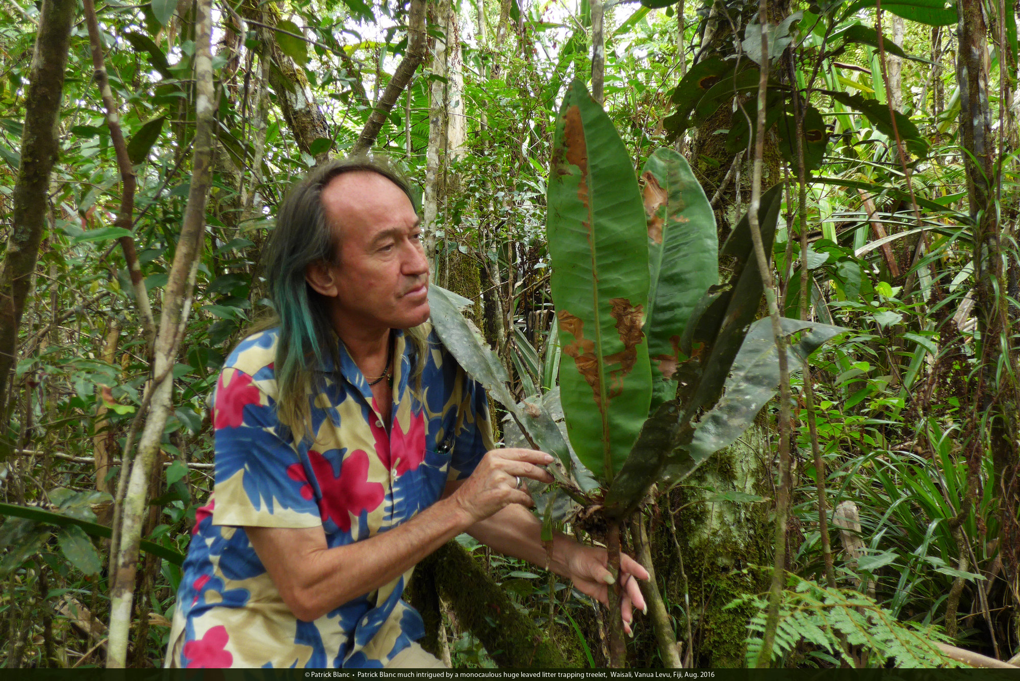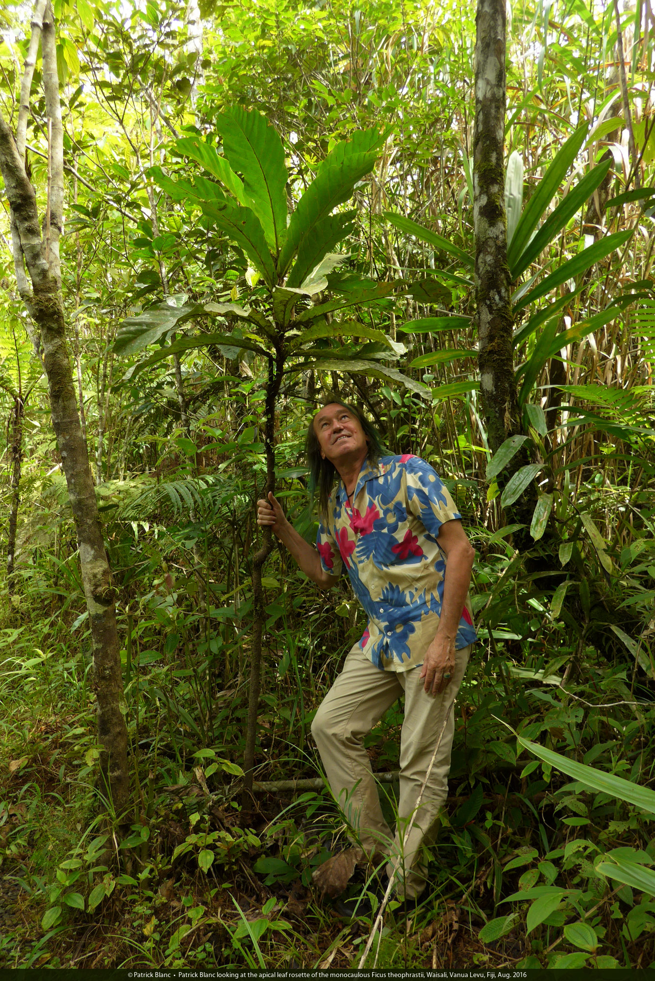 Patrick Blanc looking at the apical leaf rosette of the monocaulous Ficus theophrastoides, Waisali, Vanua Levu, Fiji, Aug. 2016eophrastii, Waisali, Vanua Levu, Fiji, Aug. 2016