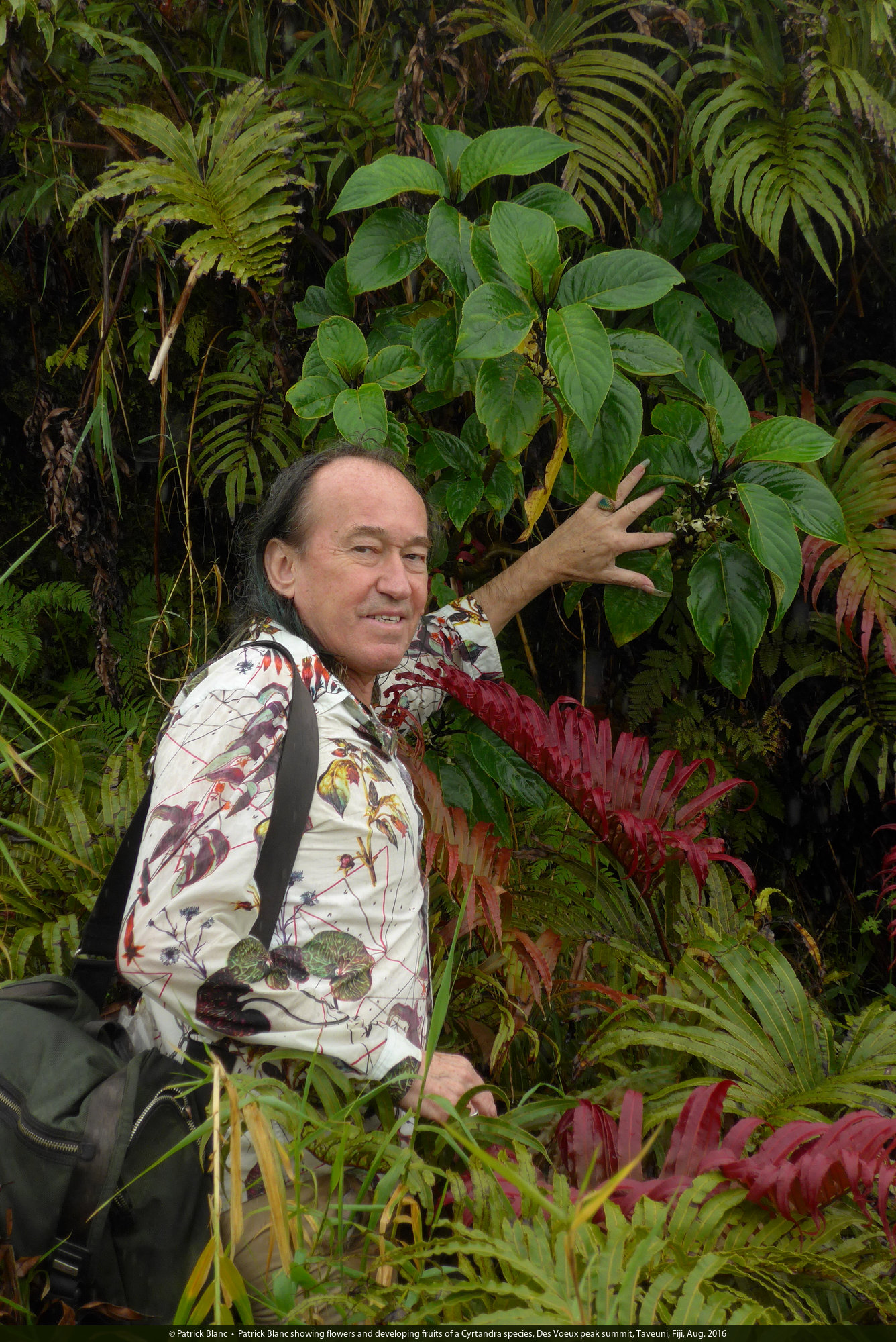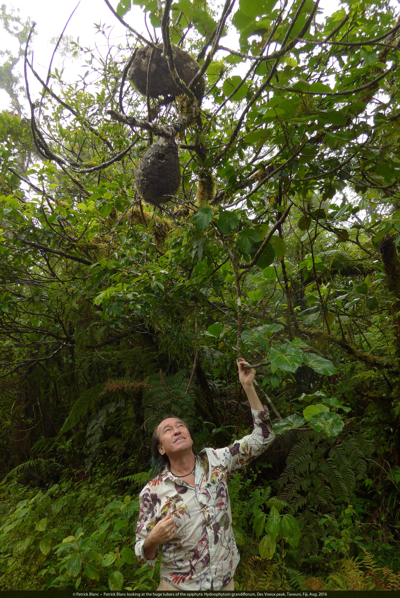 Patrick Blanc observing the epiphytic flowering Collospermum montanum, Des Voeux peak, Taveuni, Fiji, Aug. 2016