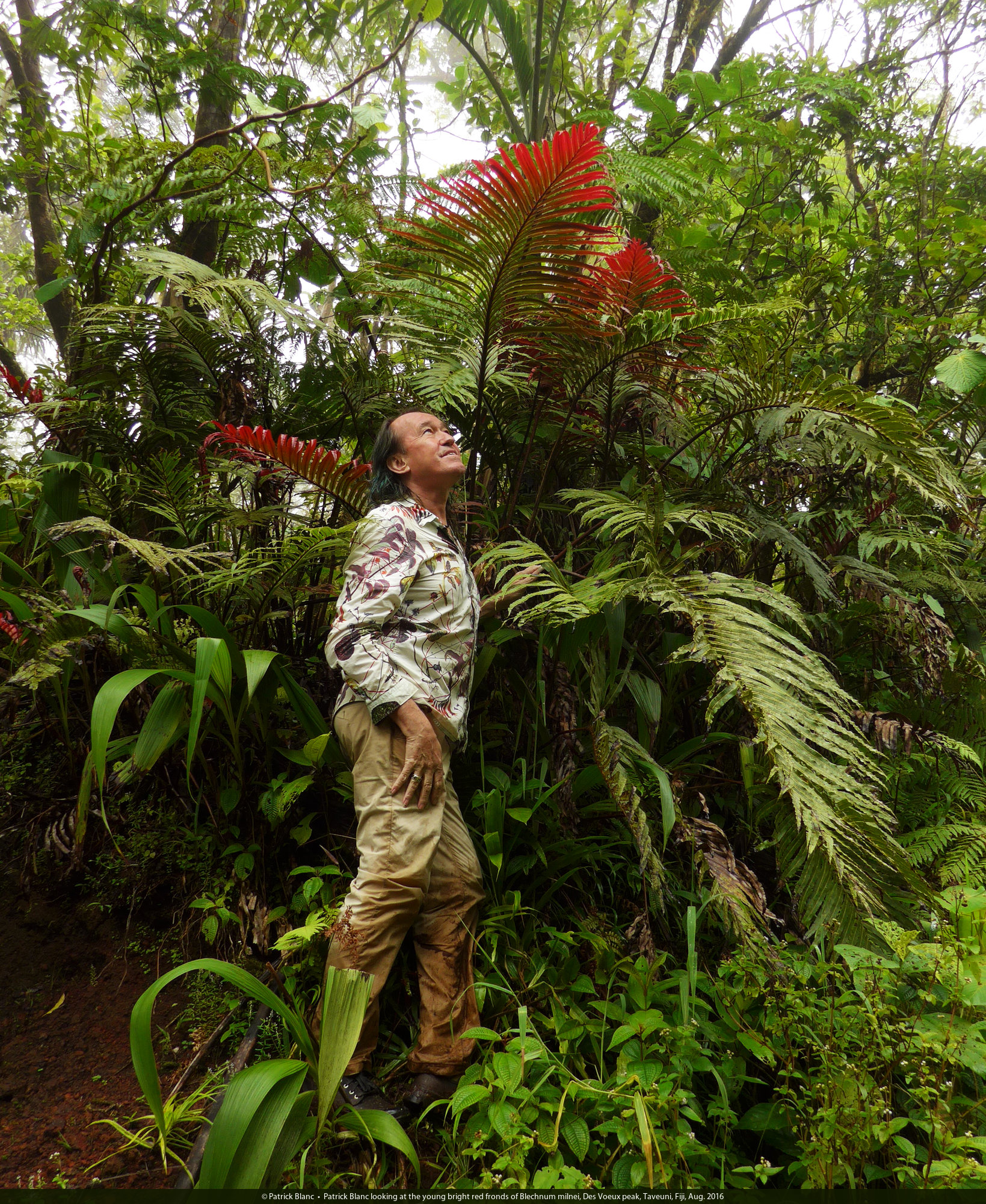 Patrick Blanc looking at the young bright red fronds of Blechnum milnei, Des Voeux peak, Taveuni, Fiji, Aug. 2016