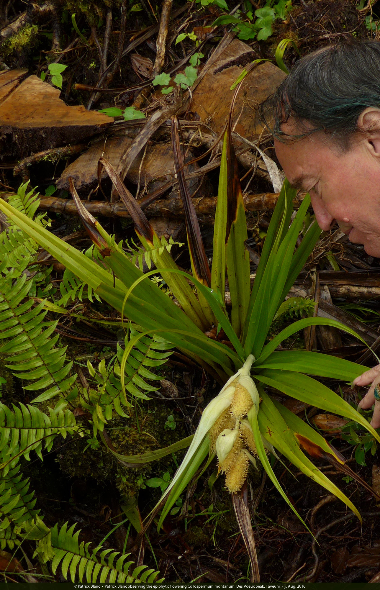 Patrick Blanc and the epiphytic flowering Collospermum montanum, fallen on the ground due to the last february typhoon, Des Voeux peak, Taveuni, Fiji, Aug. 2016