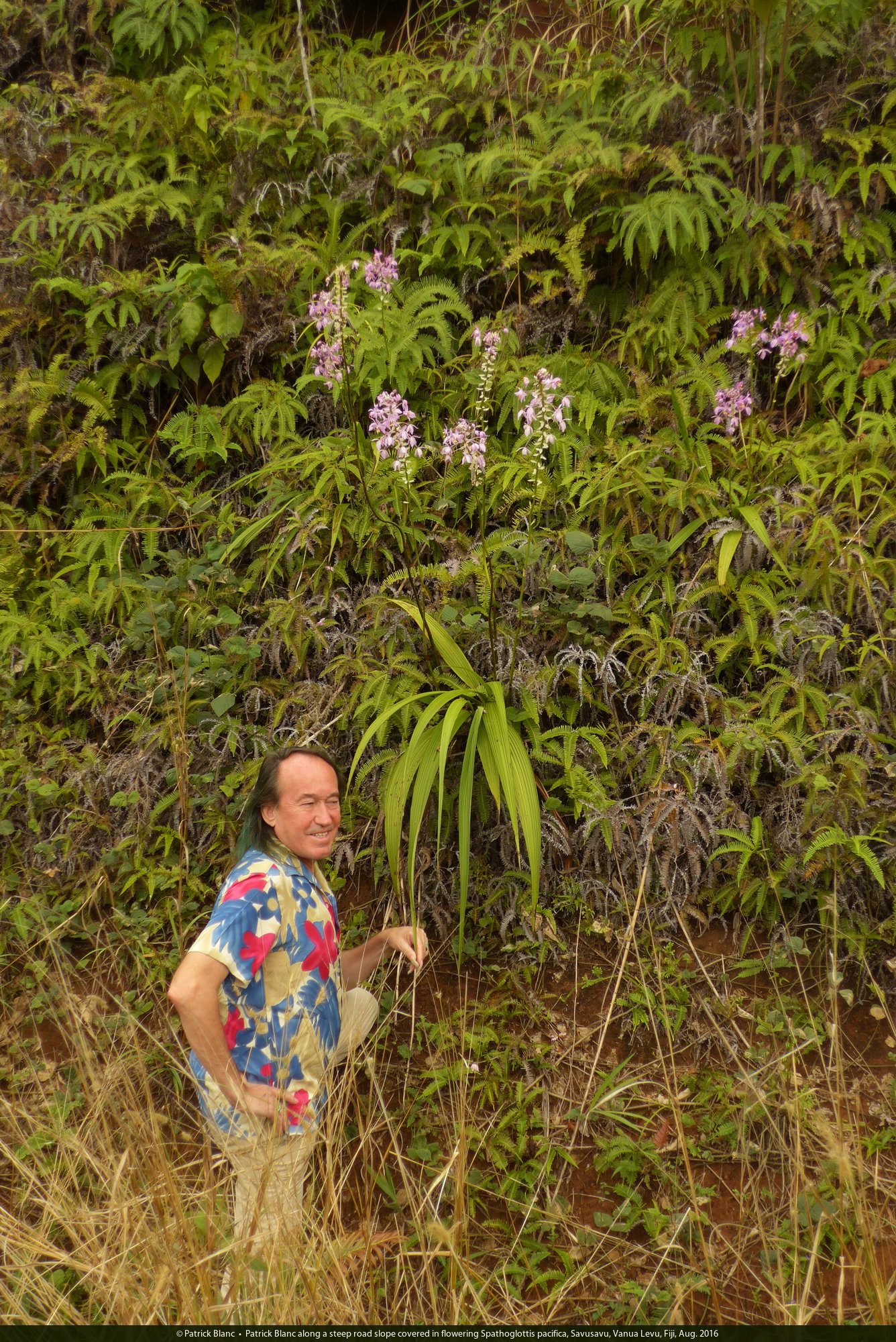 Patrick Blanc along a steep road slope covered in flowering Spathoglottis pacifica, Savusavu, Vanua Levu, Fiji, Aug. 2016