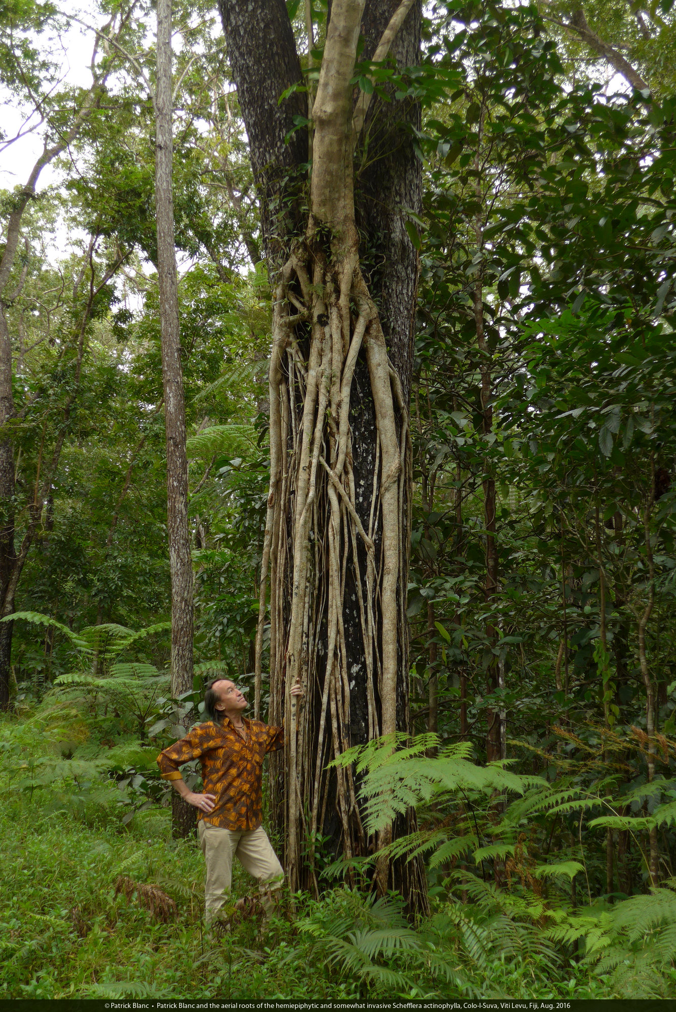 Patrick Blanc and the aerial roots of the hemiepiphytic and somewhat invasive Schefflera actinophylla, Colo-I-Suva, Viti Levu, Fiji, Aug. 2016