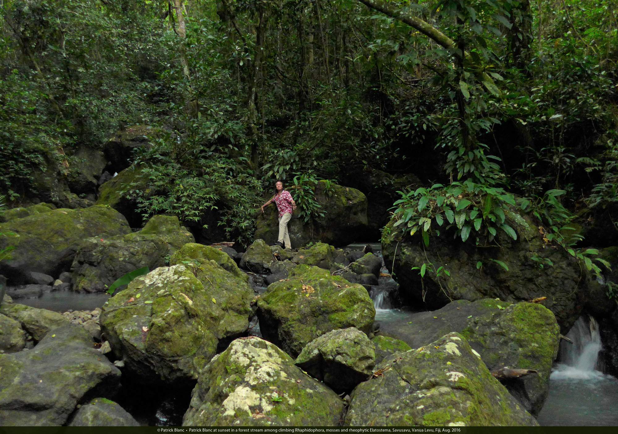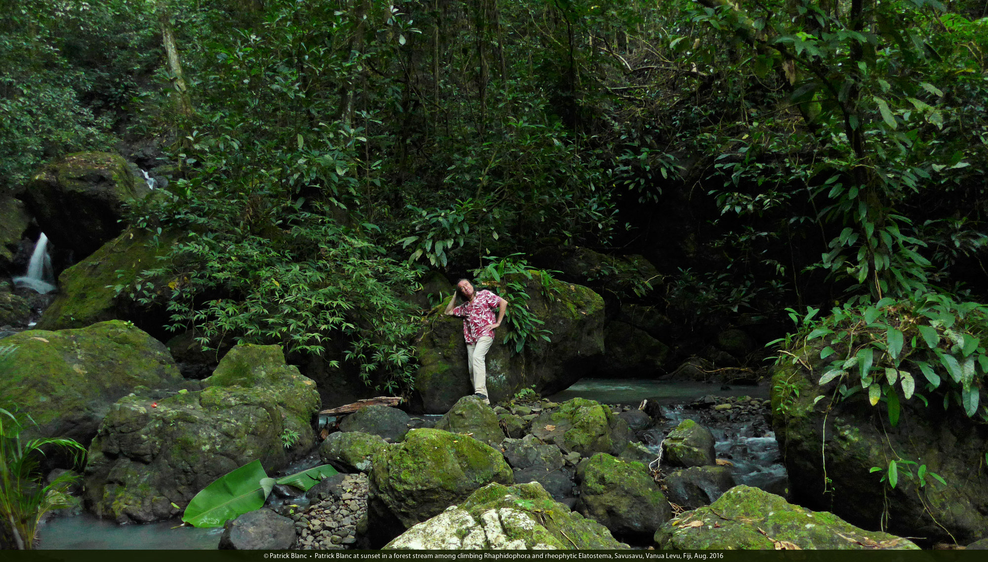 Patrick Blanc at sunset in a forest stream among climbing Rhaphidophora and rheophytic Elatostema, Savusavu, Vanua Levu, Fiji, Aug. 2016