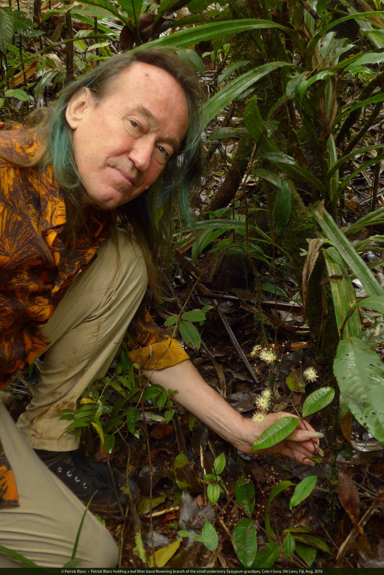 Patrick Blanc holding a leaf litter basal flowering branch of the small understory Syzygium gracilipes, Colo-I-Suva, Viti Levu, Fiji, Aug. 2016