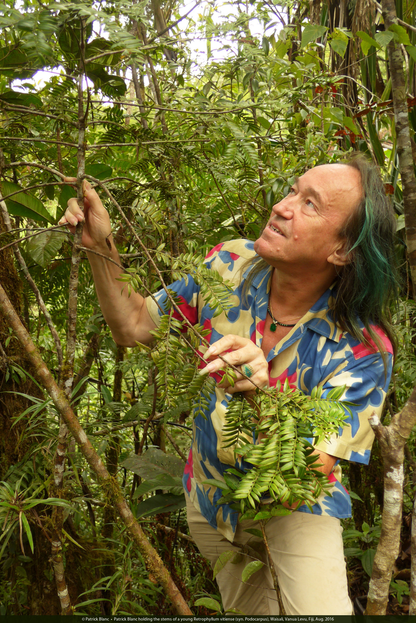 Patrick Blanc holding the stems of a young Retrophyllum vitiense (syn. Podocarpus), Waisali, Vanua Levu, Fiji, Aug. 2016