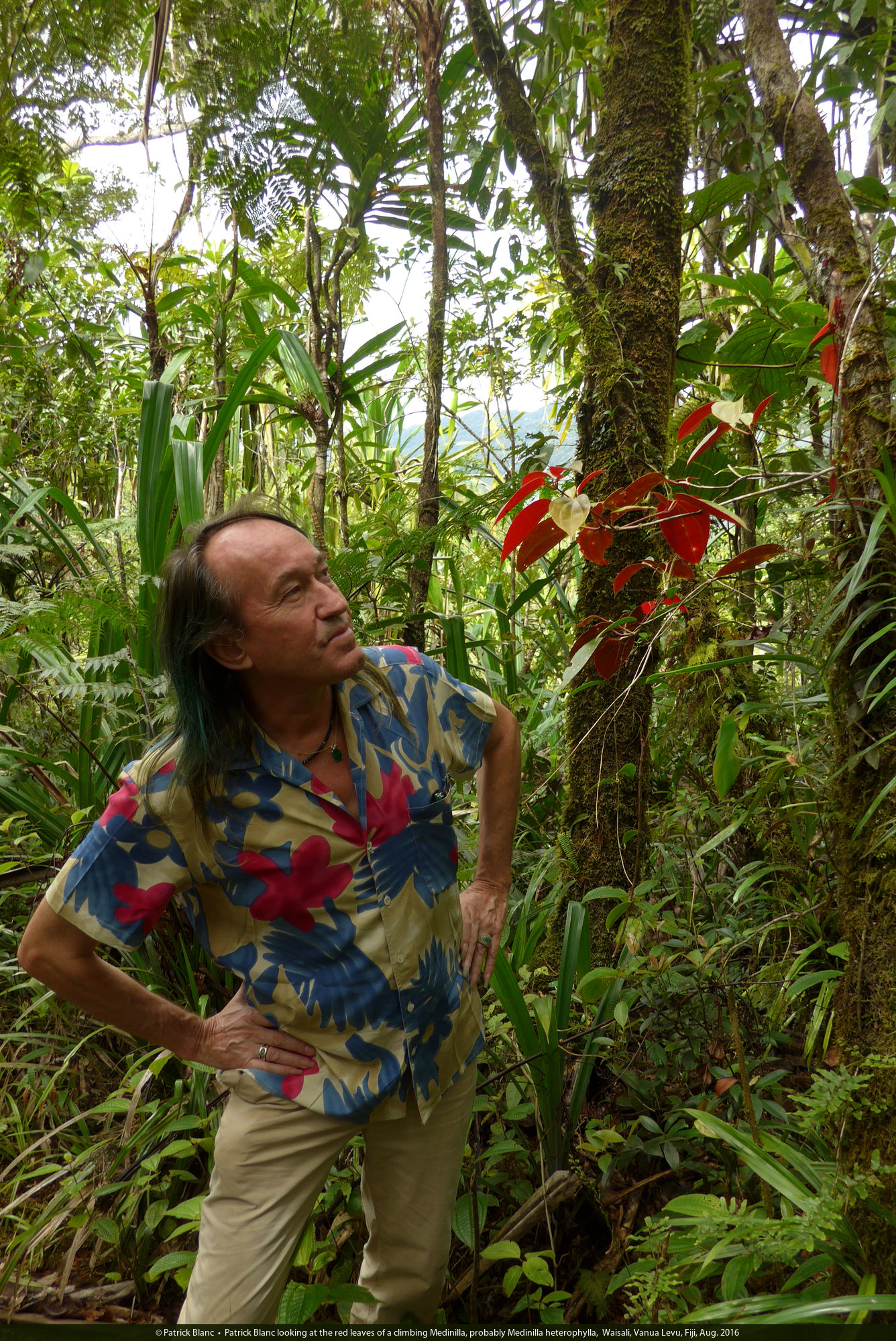 Patrick Blanc looking at the red leaves of a climbing Medinilla, probably Medinilla heterophylla, Waisali, Vanua Levu, Fiji, Aug. 2016