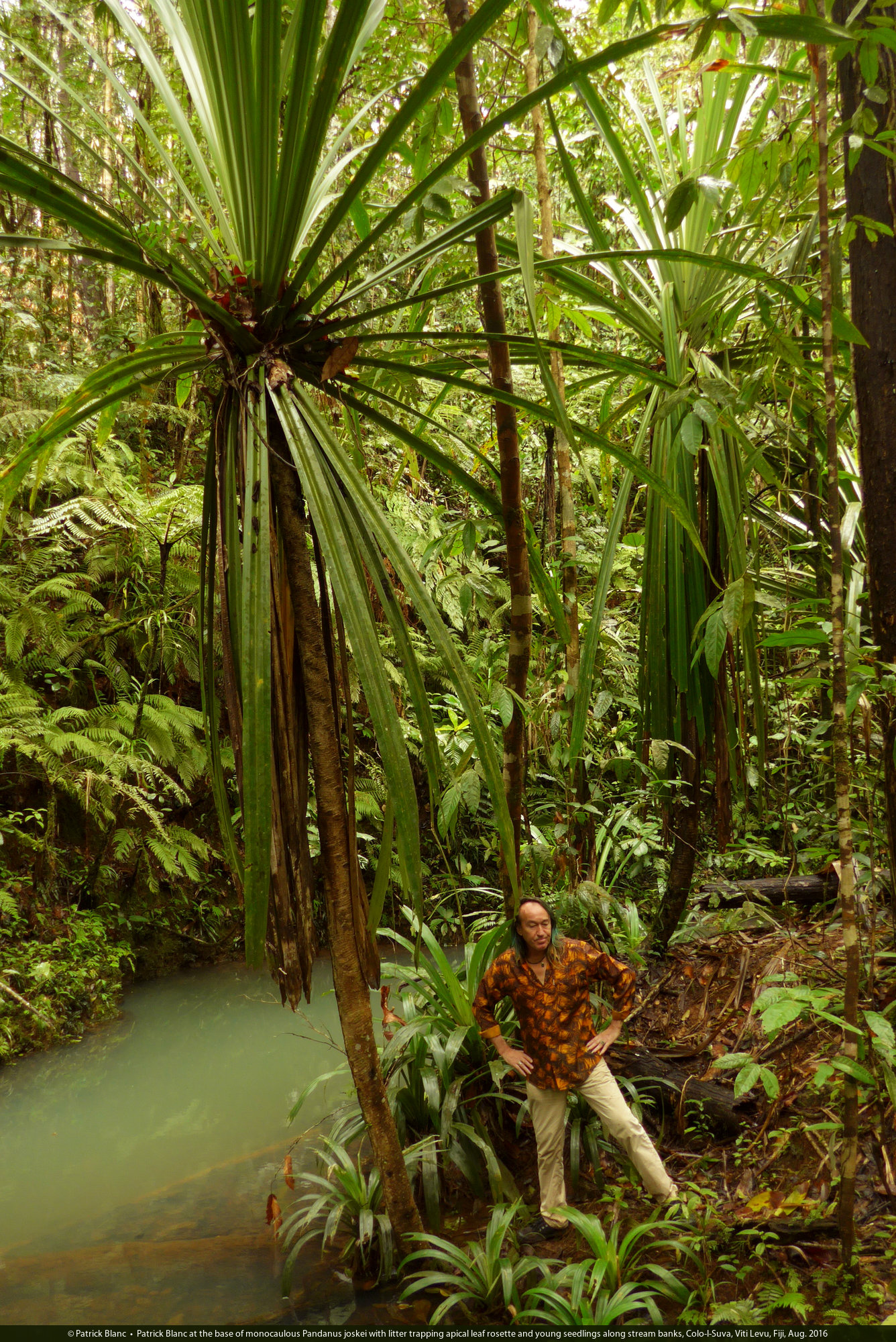 Patrick Blanc at the base of monocaulous Pandanus joskei bearing lateral inflorescences at the base of the leaf rosette, Colo-I-Suva, Viti Levu, Fiji, Aug. 2016