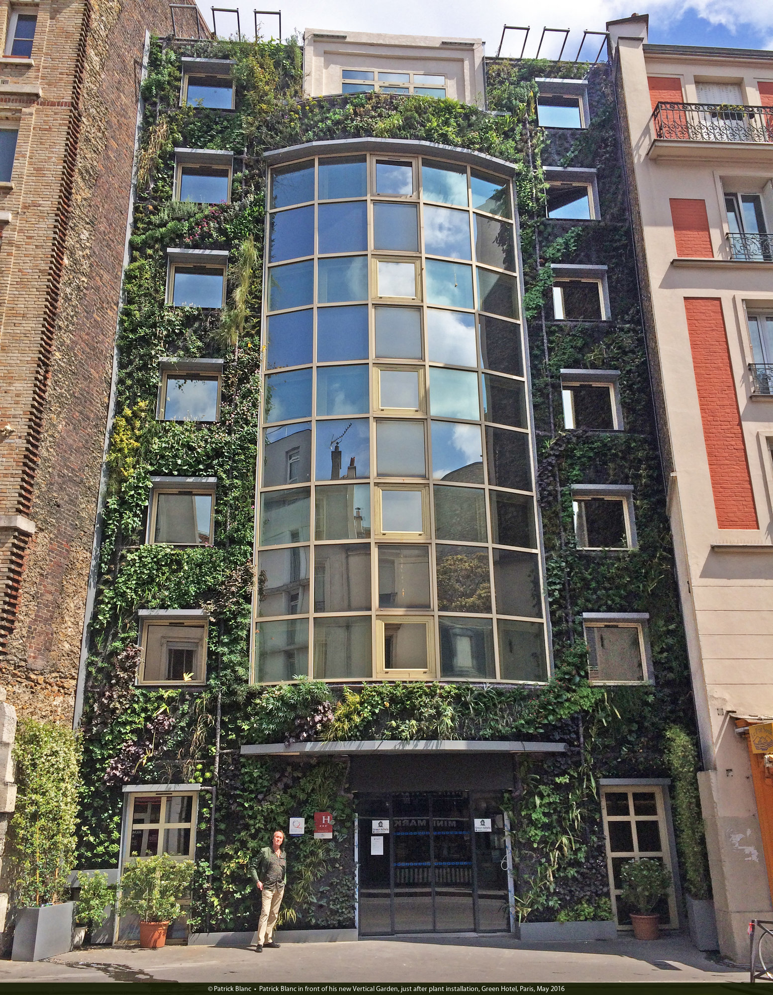 Patrick Blanc in front of his new Vertical Garden, just after plant installation, Green Hotel, Paris, May 2016