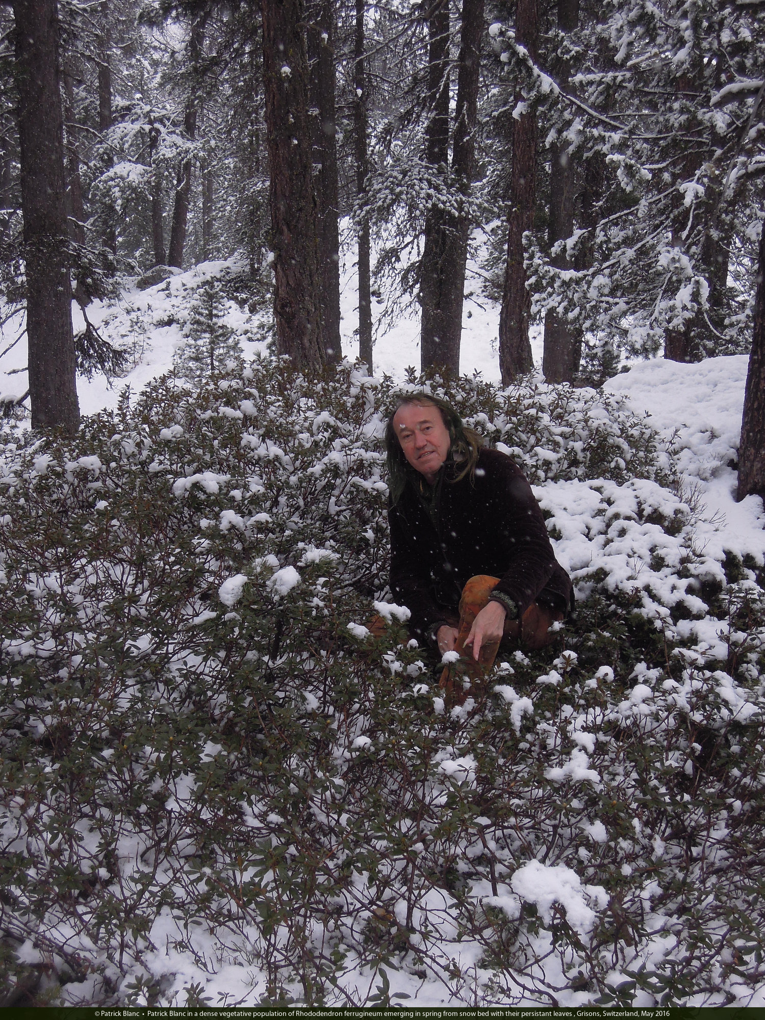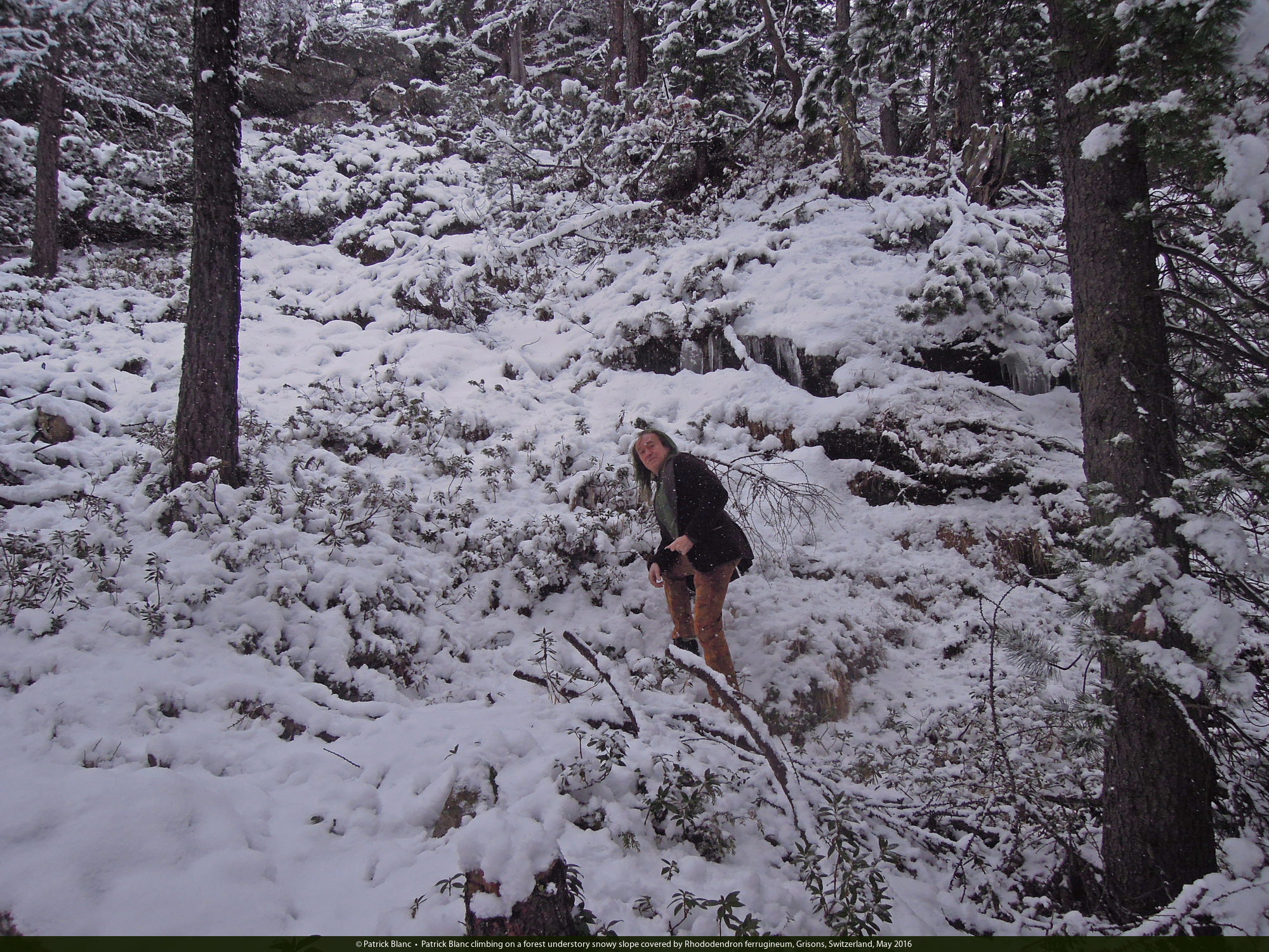 Patrick Blanc climbing on a forest understory snowy slope covered by Rhododendron ferrugineum, Grisons, Switzerland, May 2016