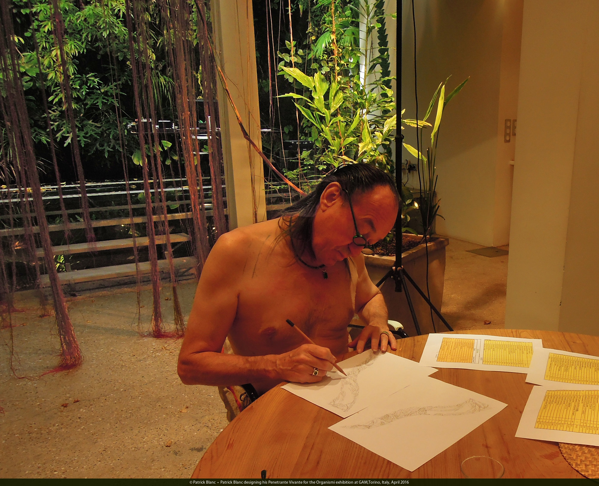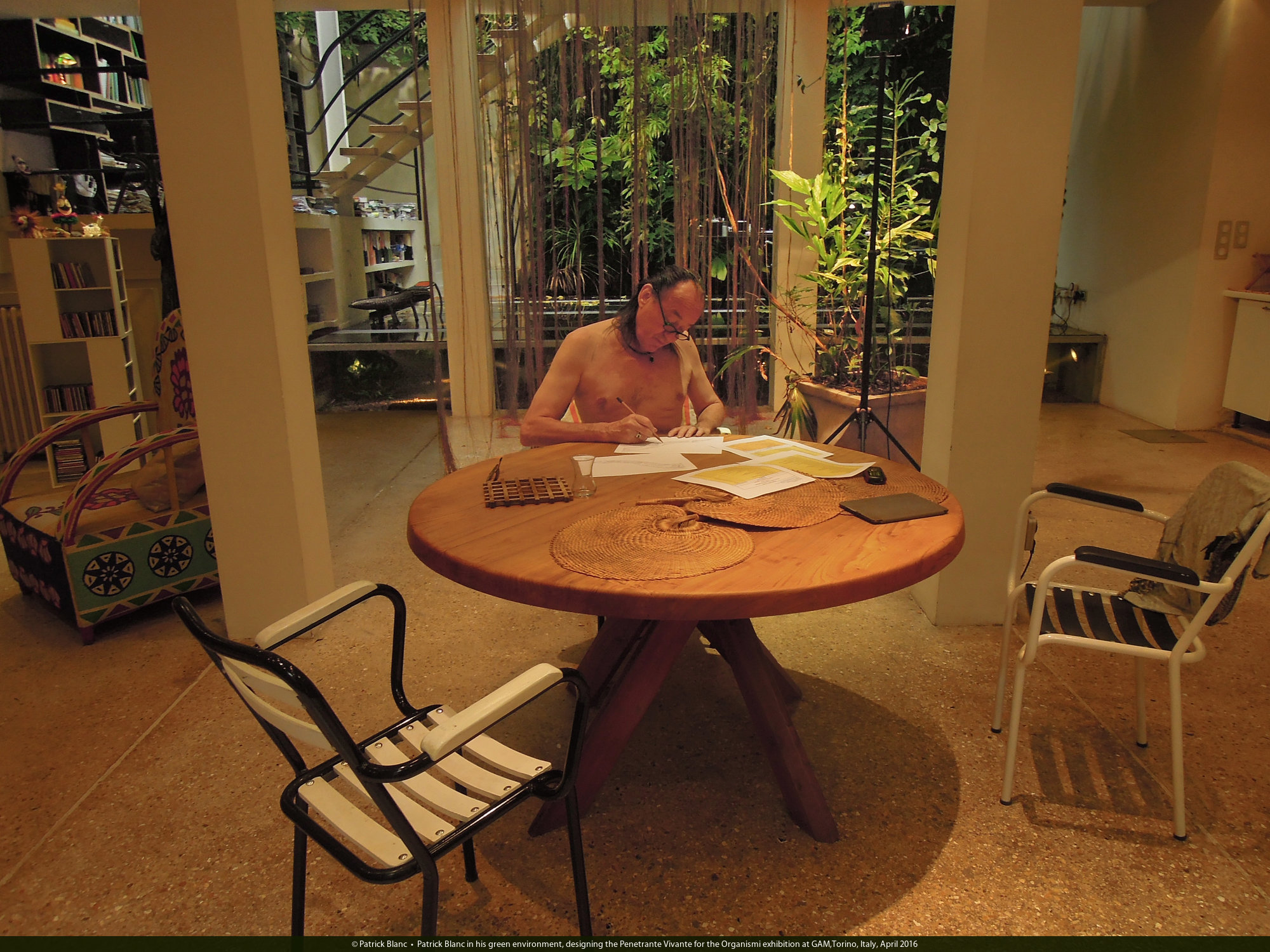 Patrick Blanc in his green environment, designing the Penetrante Vivante for the Organismi exhibition at GAM,Torino, Italy, April 2016