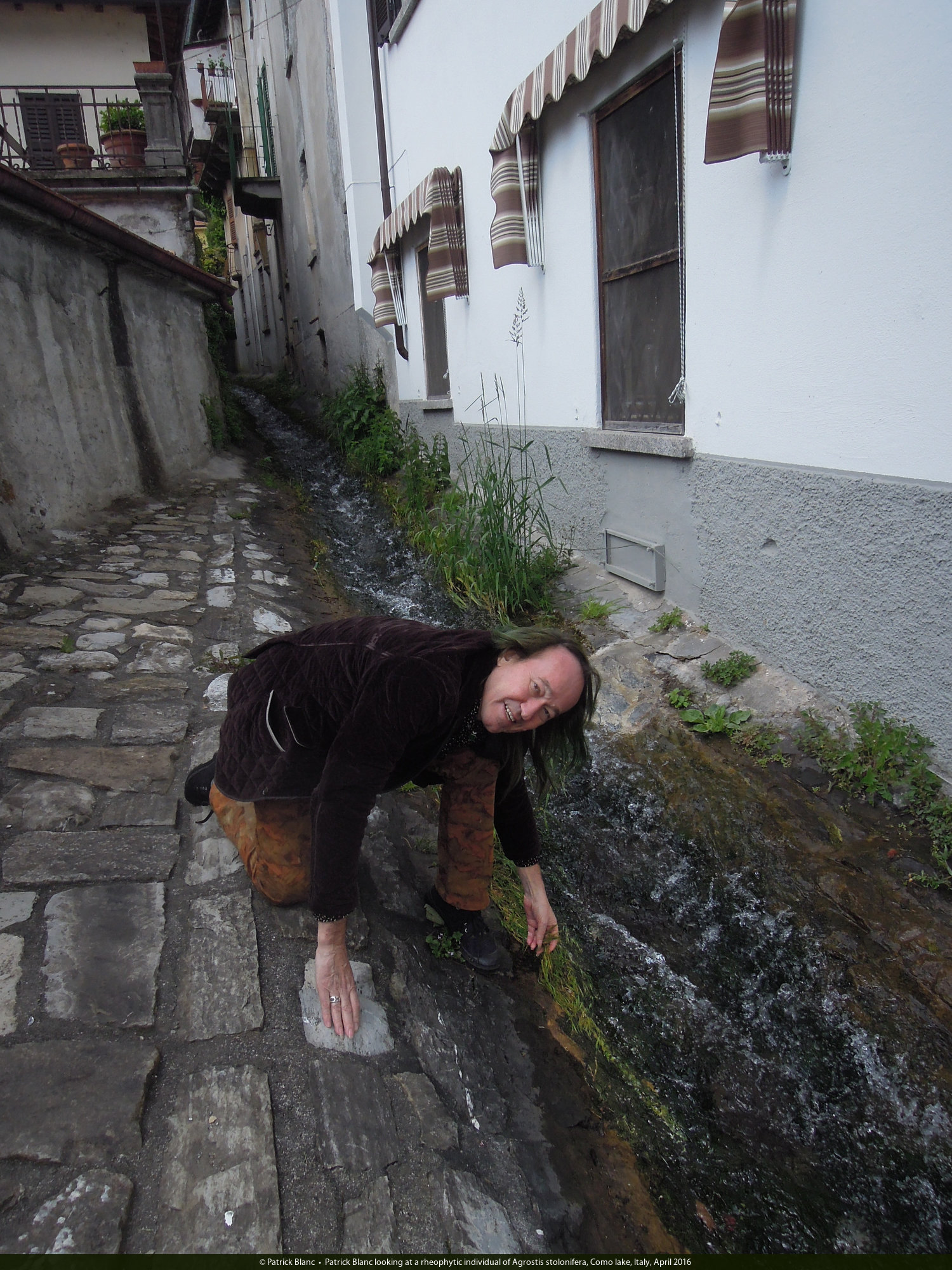 Patrick Blanc looking at a rheophytic individual of Agrostis stolonifera, Como lake, Italy, April 2016
