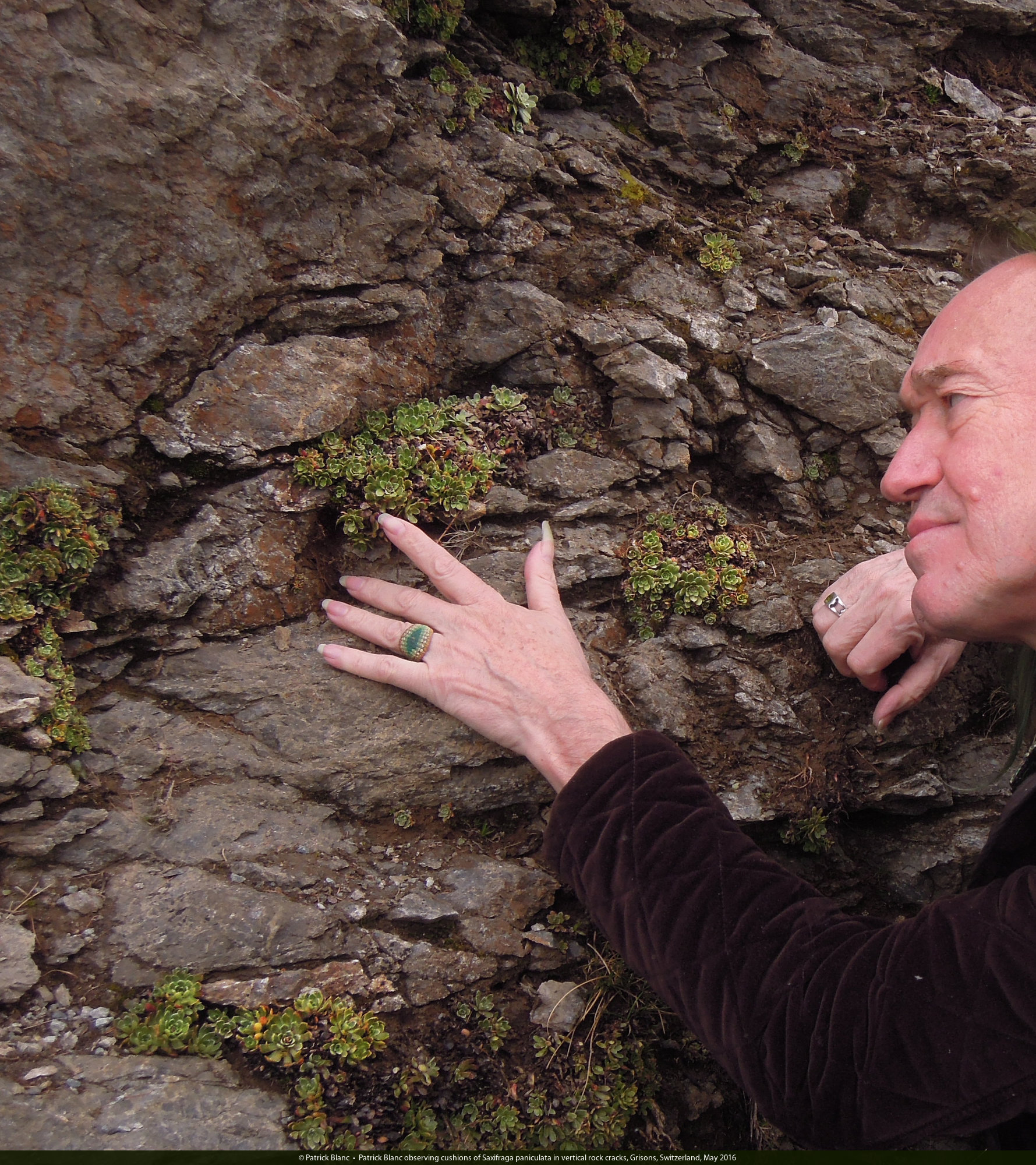 Patrick Blanc observing cushions of Saxifraga paniculata in vertical rock cracks, Grisons, Switzerland, May 2016