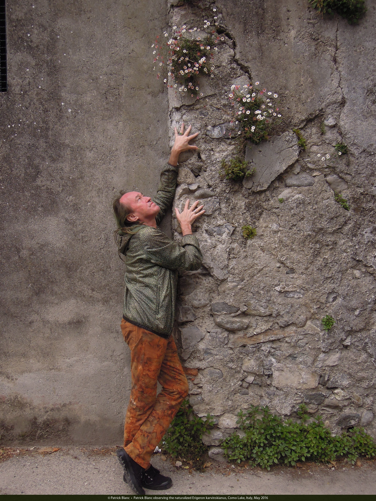 Patrick Blanc observing the naturalized Erigeron karvinskianus, Como Lake, Italy, May 2016