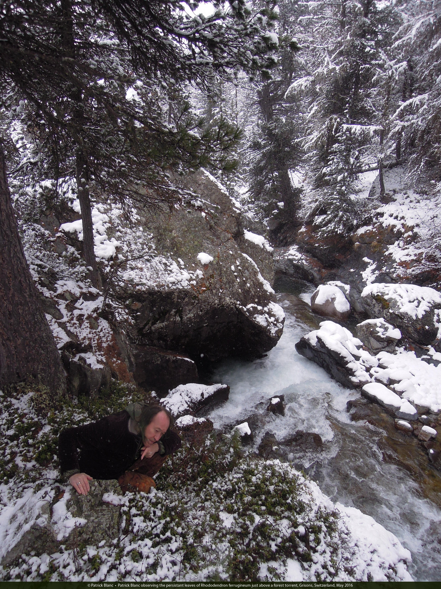 Patrick Blanc observing the persistant leaves of Rhododendron ferrugineum just above a forest torrent, Grisons, Switzerland, May 2016